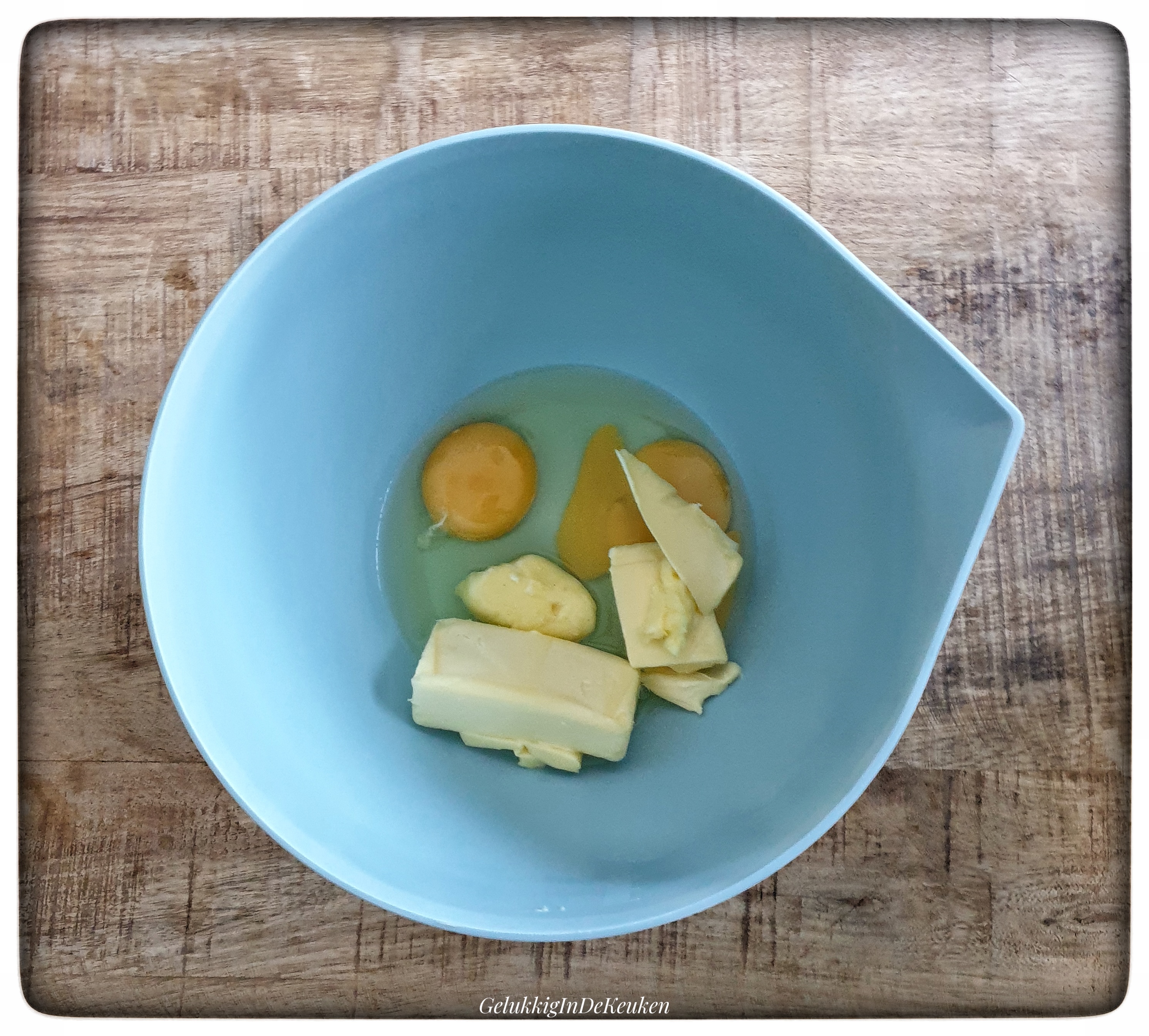 Mix in een andere kom de eieren en boter voor 2 minuten met een handmixer op de hoogste stand.