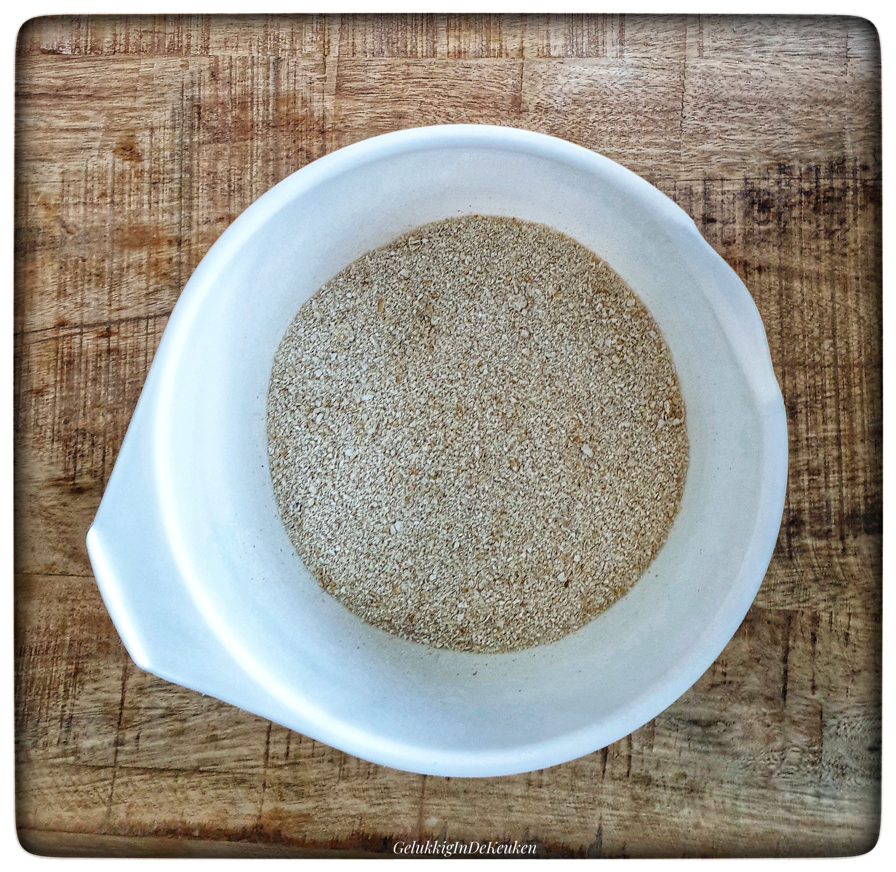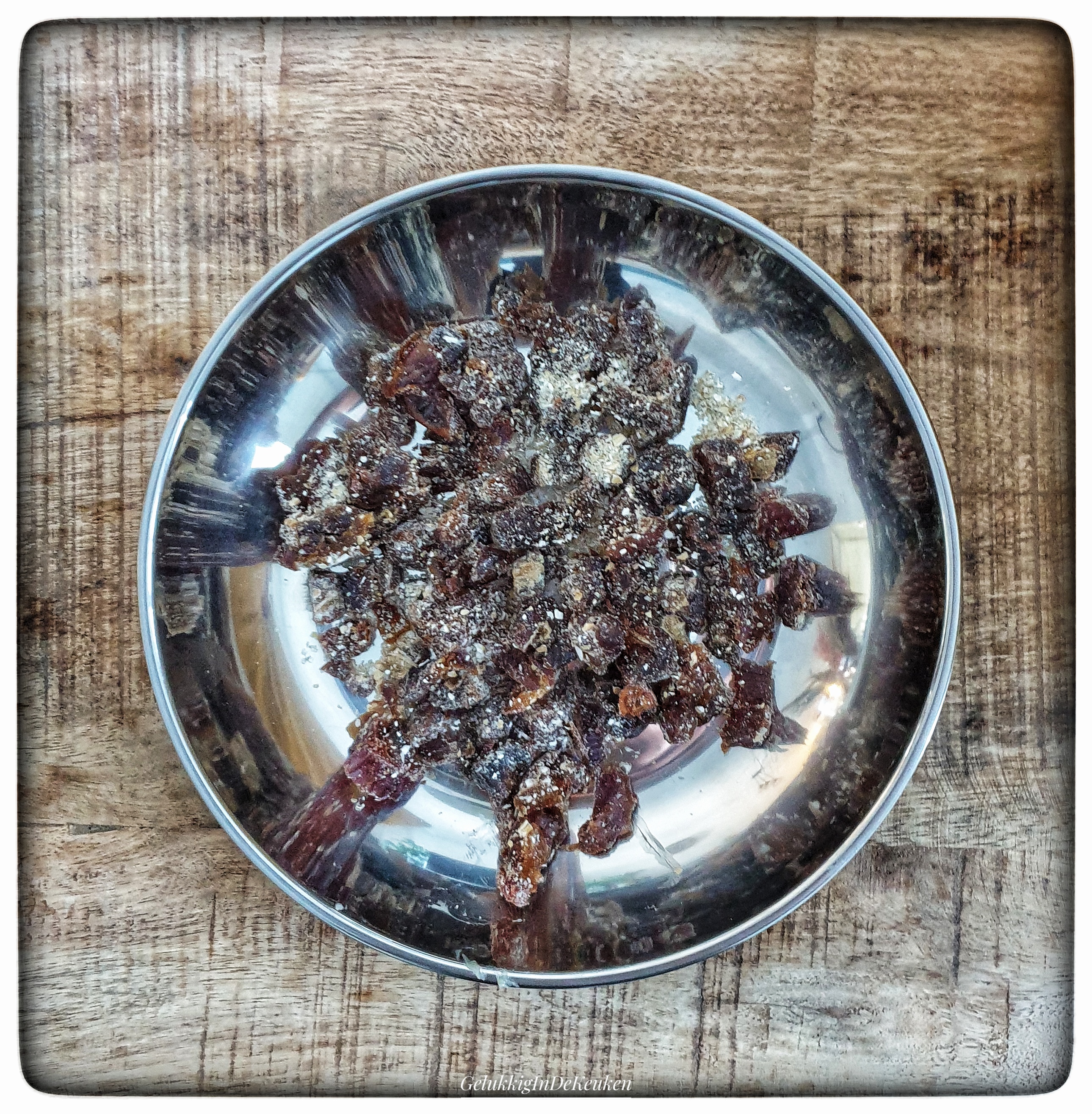 Doe de havermout in een kom met de overige droge ingrediënten en meng goed door. Neem 1 eetlepel hiervan en meng het met de stukjes dadels. Laat het even staan.