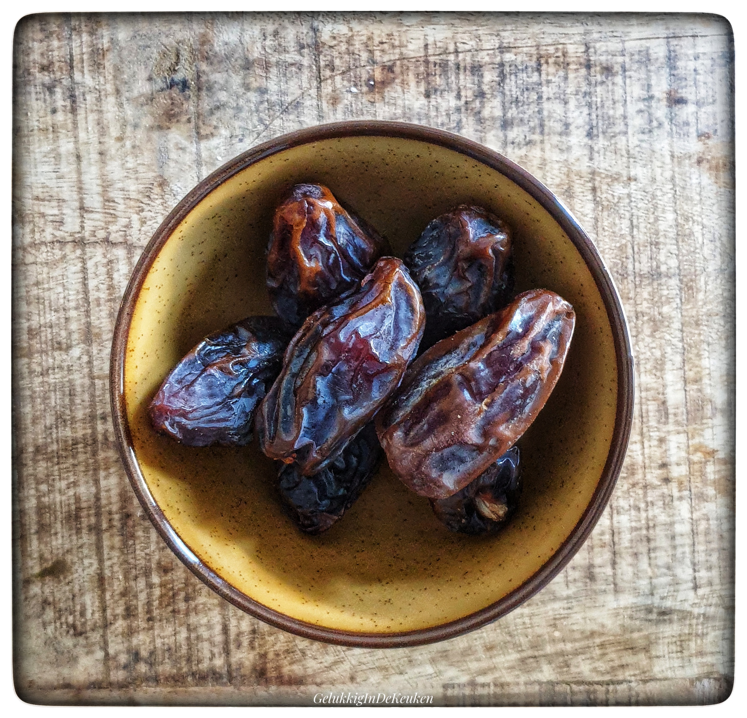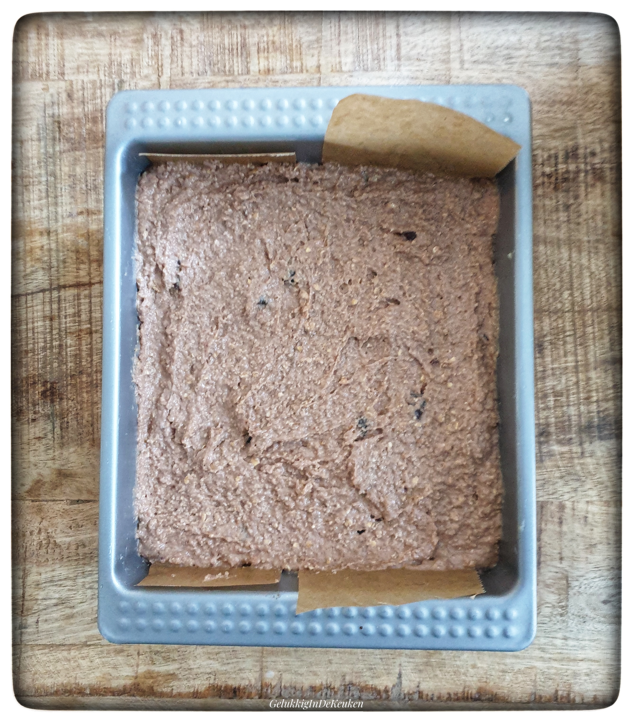 Voeg de droge ingrediënten toe en spatel tot het goed gemengd is. Doe de dadels erbij en spatel door het beslag.