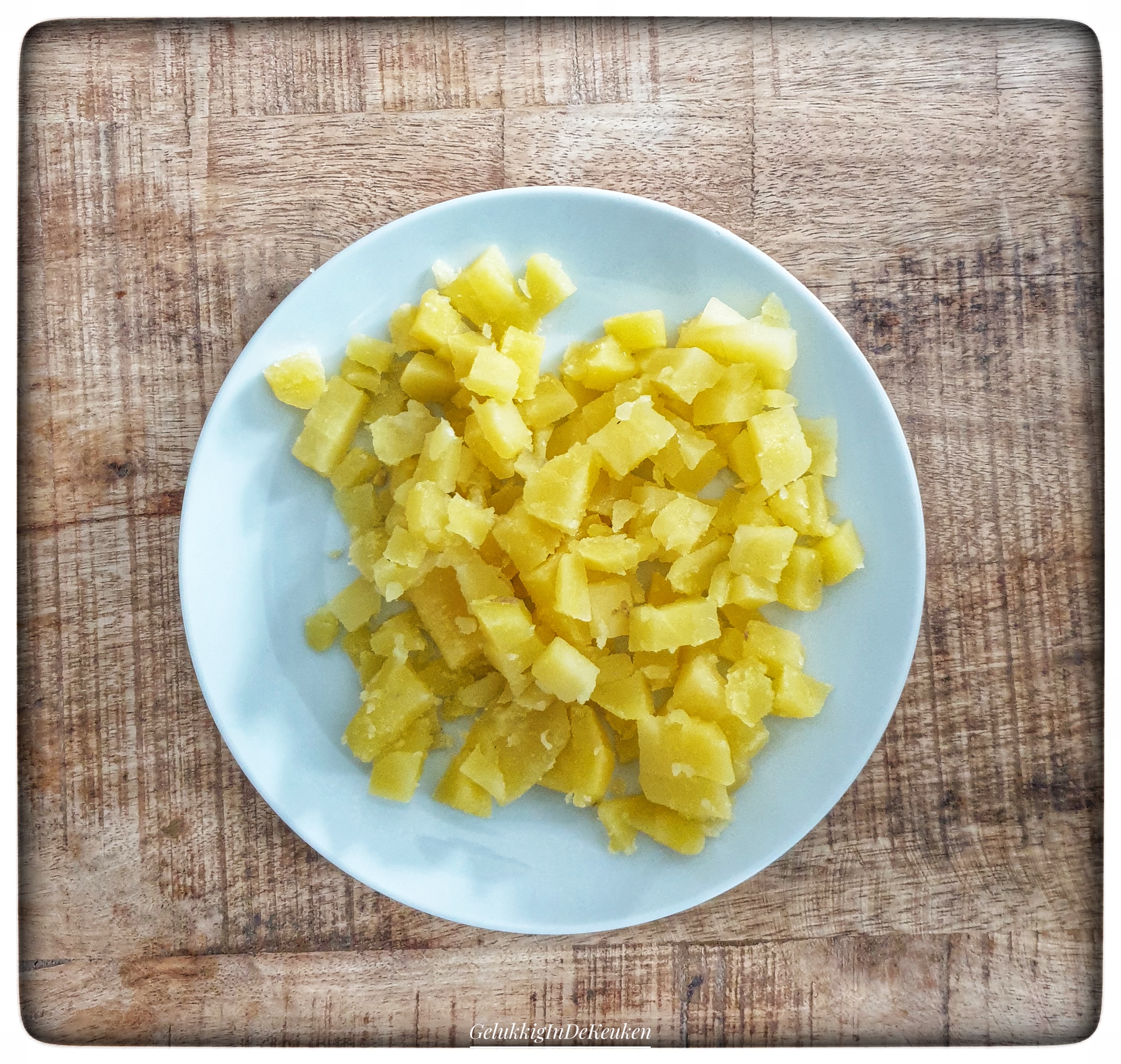 Giet de aardappel af en laat het even afkoelen. Schil daarna de aardappel en snijd het in kleine blokjes.