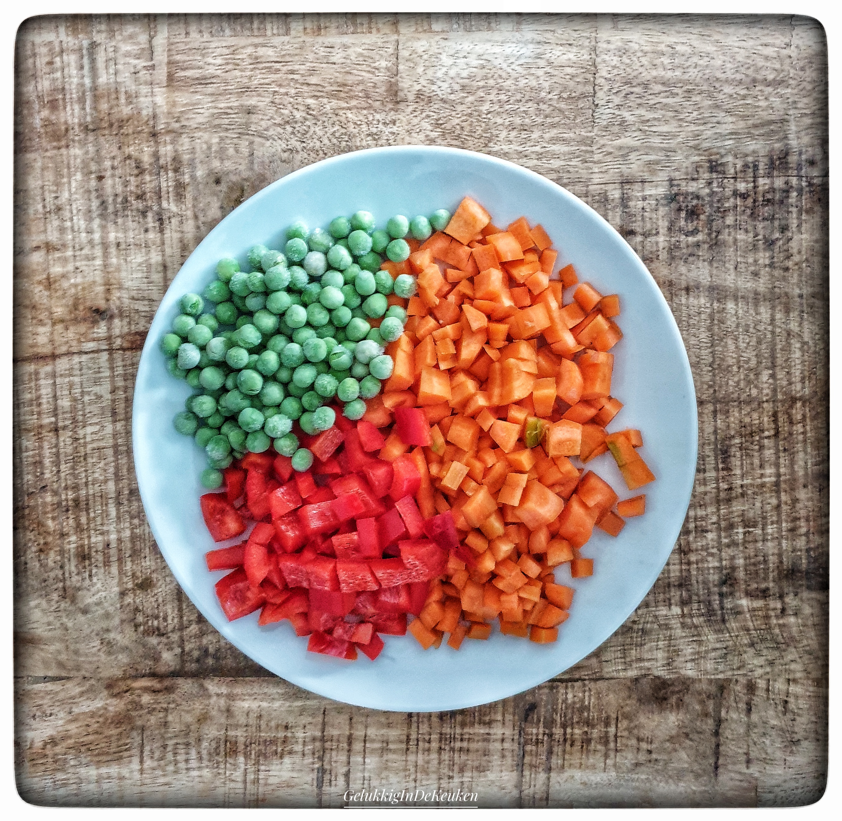 Snijd de wortels, paprika en tomaat in kleine blokjes.