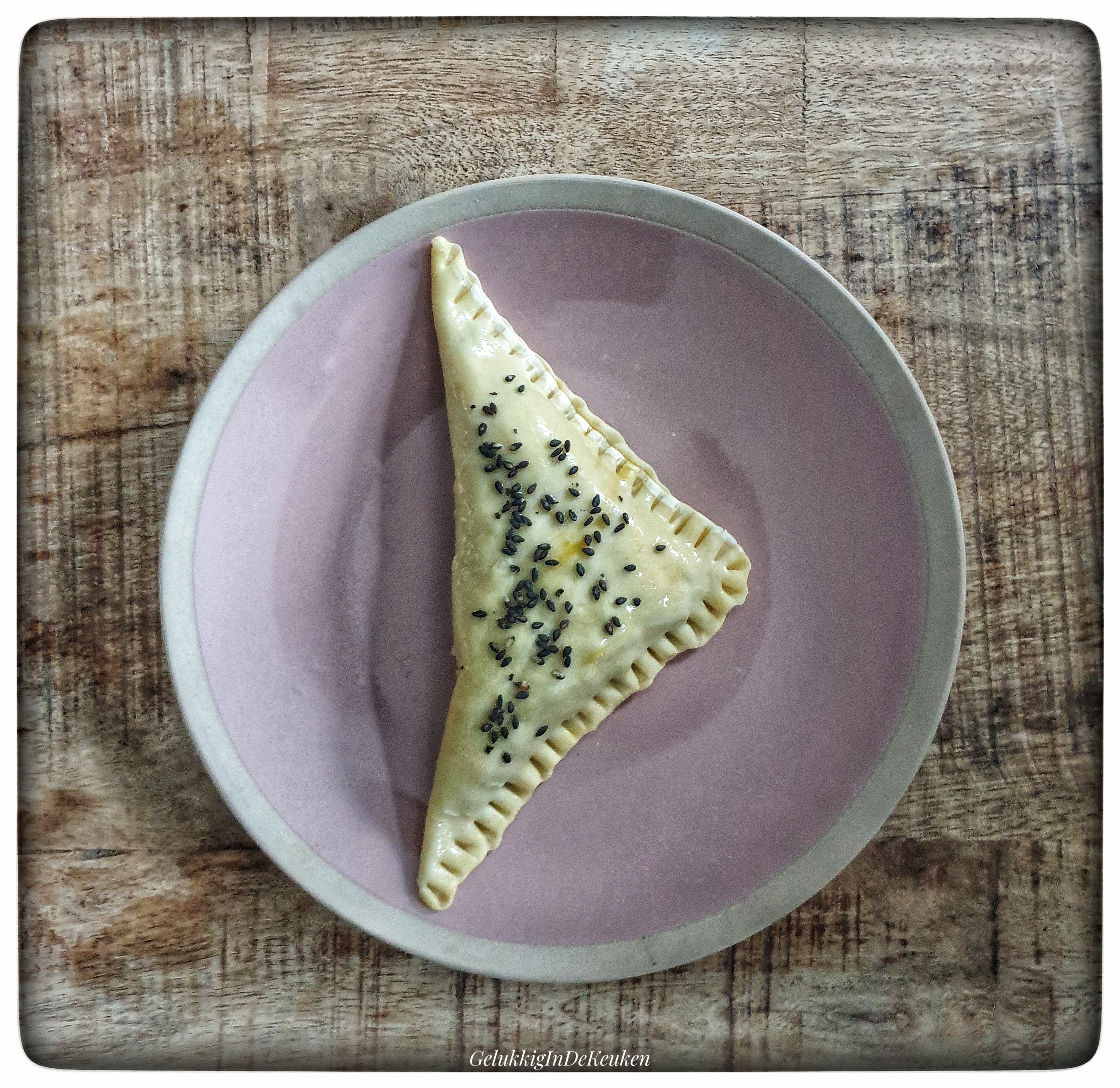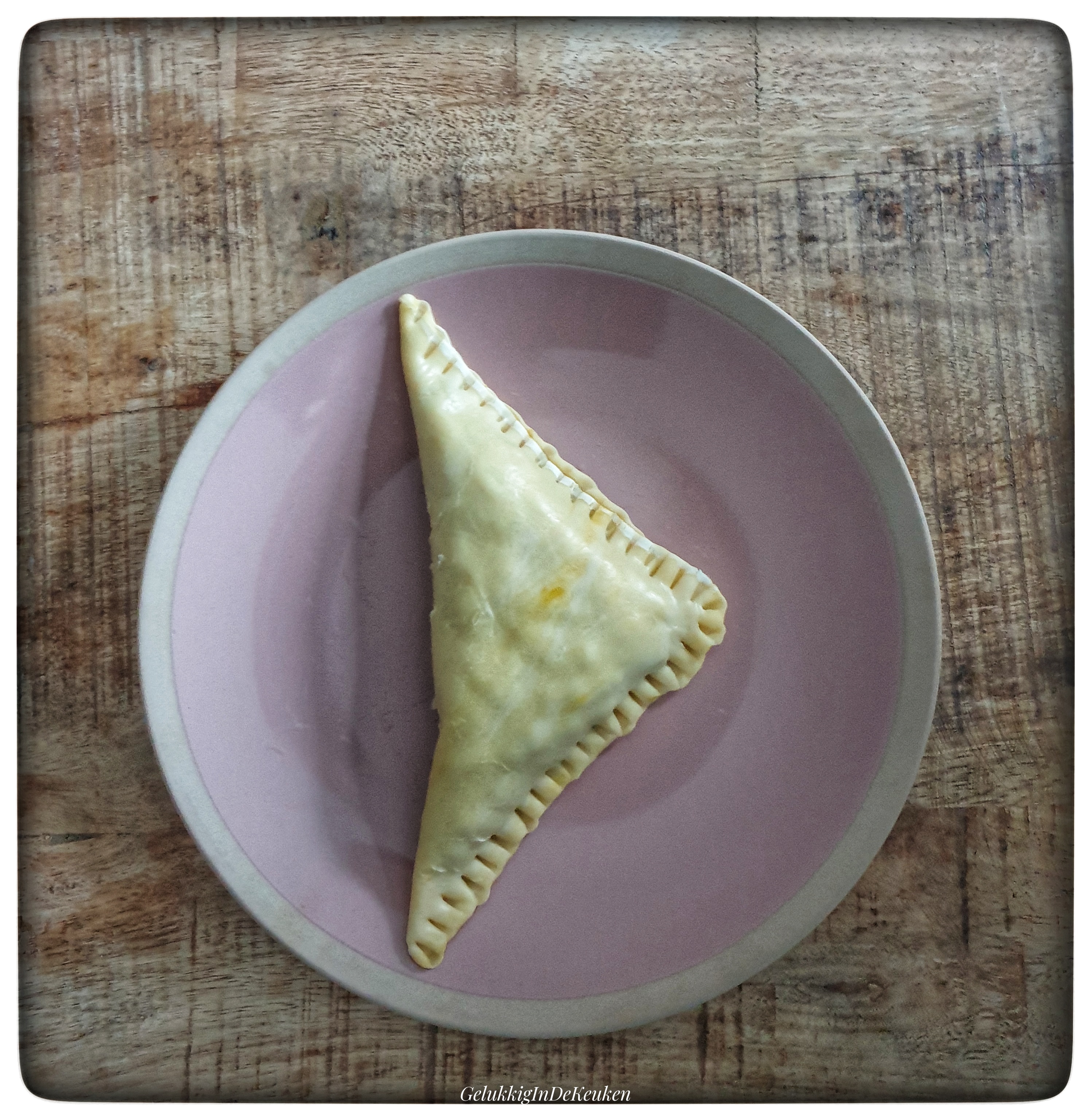 Leg wat vulling op een hoek van de bladerdeegvel en laat de randjes vrij. Vouw de deeg dubbel en druk de randjes aan met een vork.