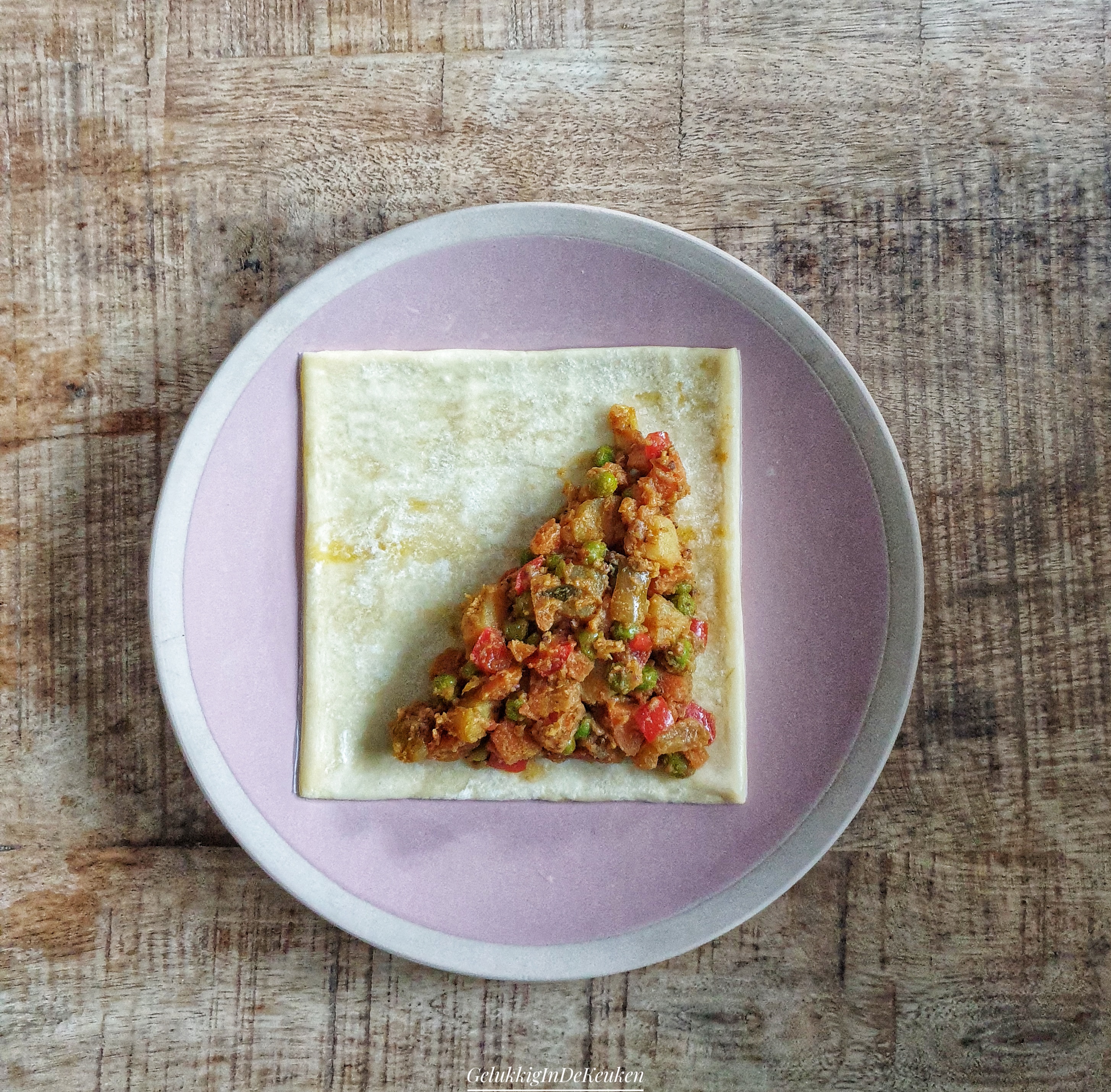 Vegetarische bladerdeeghapjes met een kruidige vulling van aardappel, wortel, paprika en doperwten.