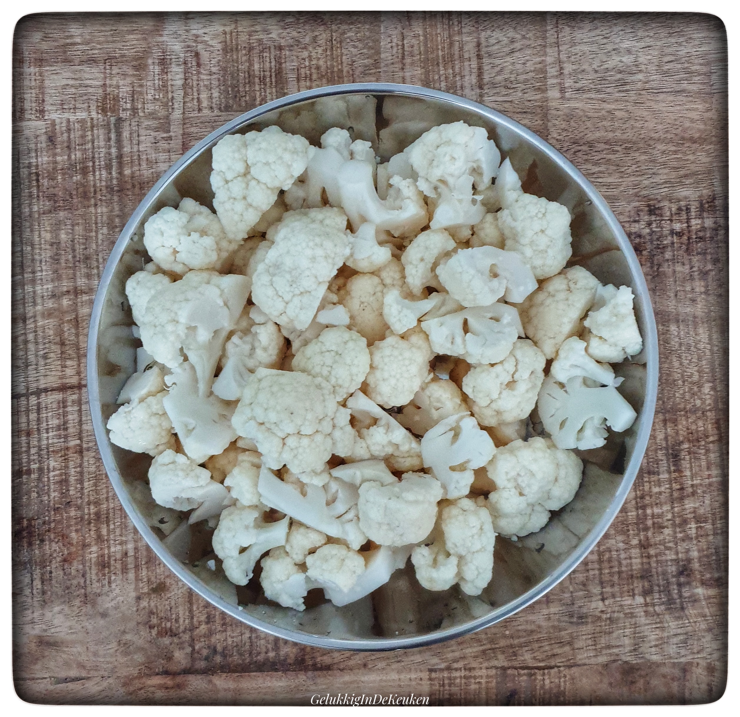 De bloemkool is lekker met gebakken aardappelen en eventueel vis of kip erbij.