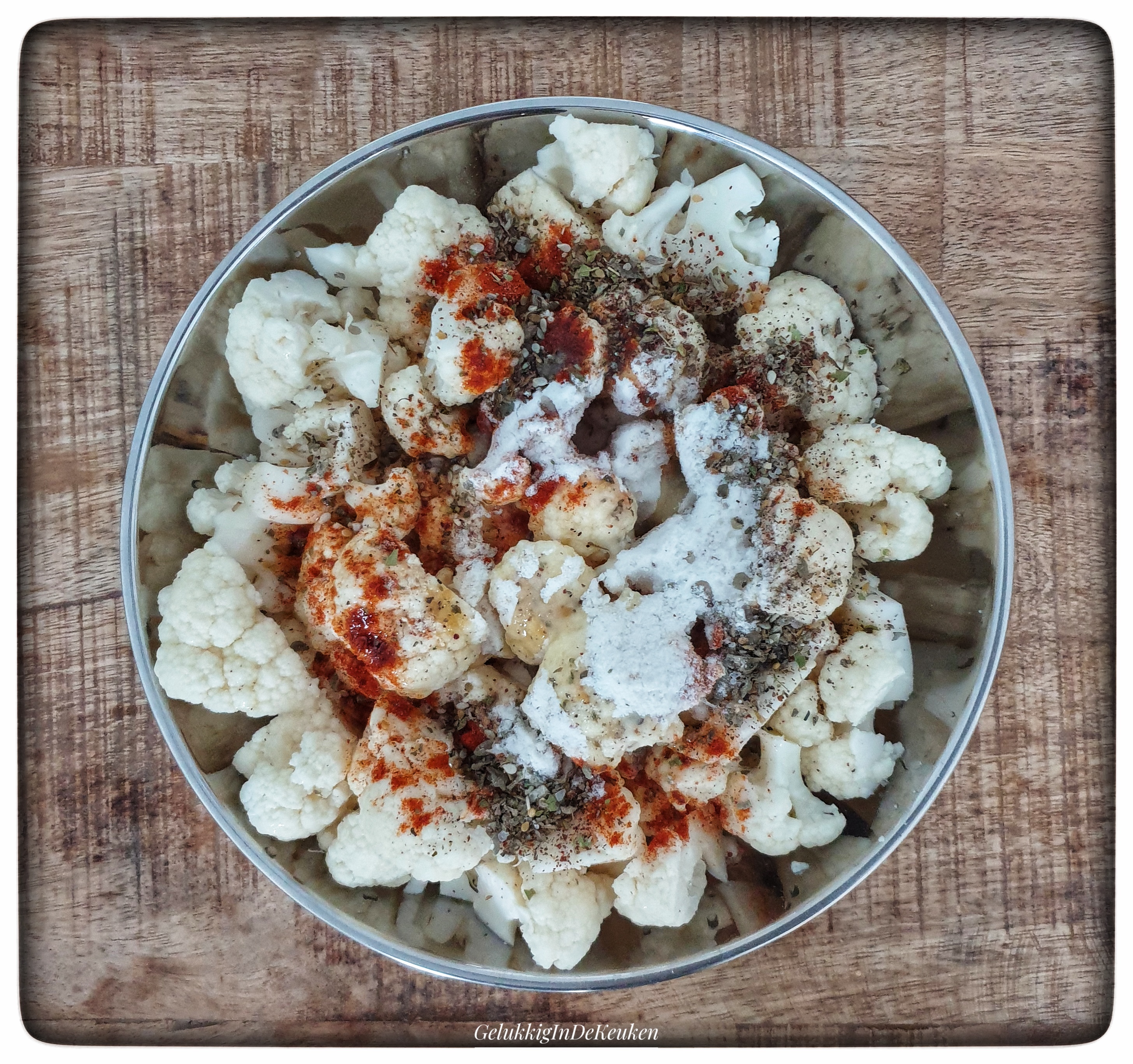 Het recept is simpel en heeft geen heftige smaak. Je snijdt de bloemkool in hapklare roosjes, mengt het met de rest van de ingrediënten en de oven doet het rest van het werk.