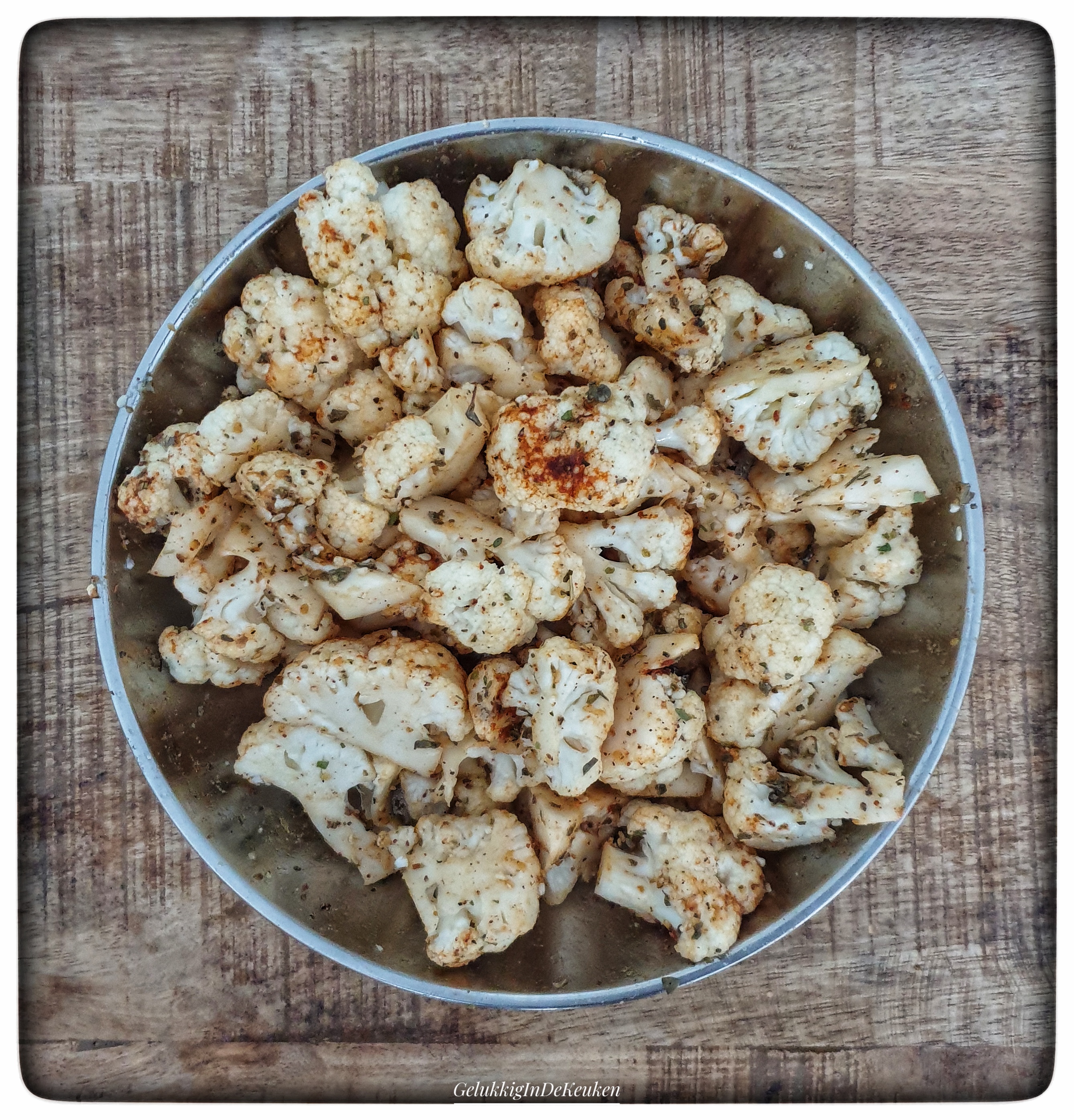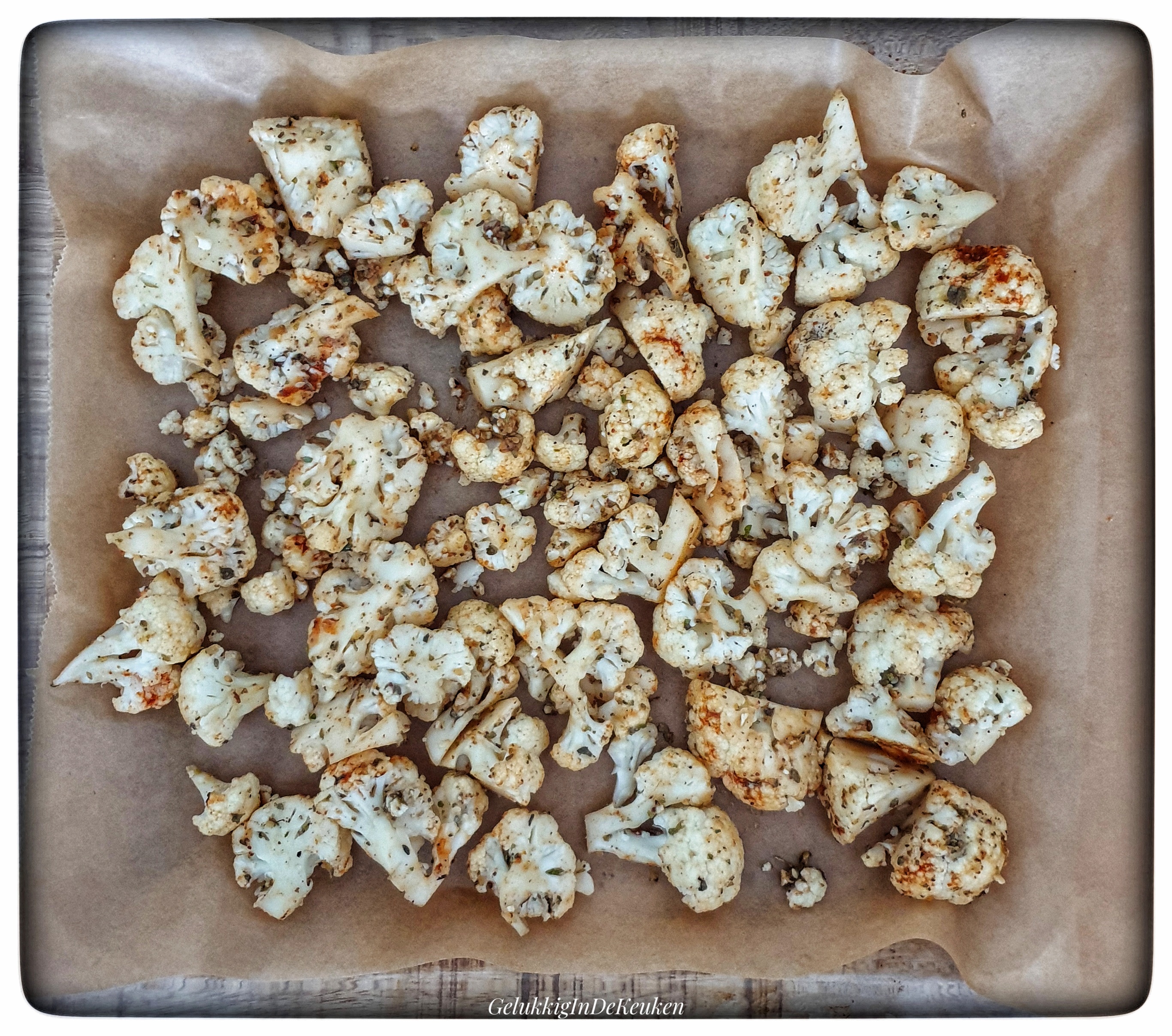 Bloemkool is niet mijn favoriete groente. Vooral gekookt vind ik het niet lekker, maar uit de oven vind ik het heerlijk. De bloemkool is aan de buitenkant lekker knapperig.