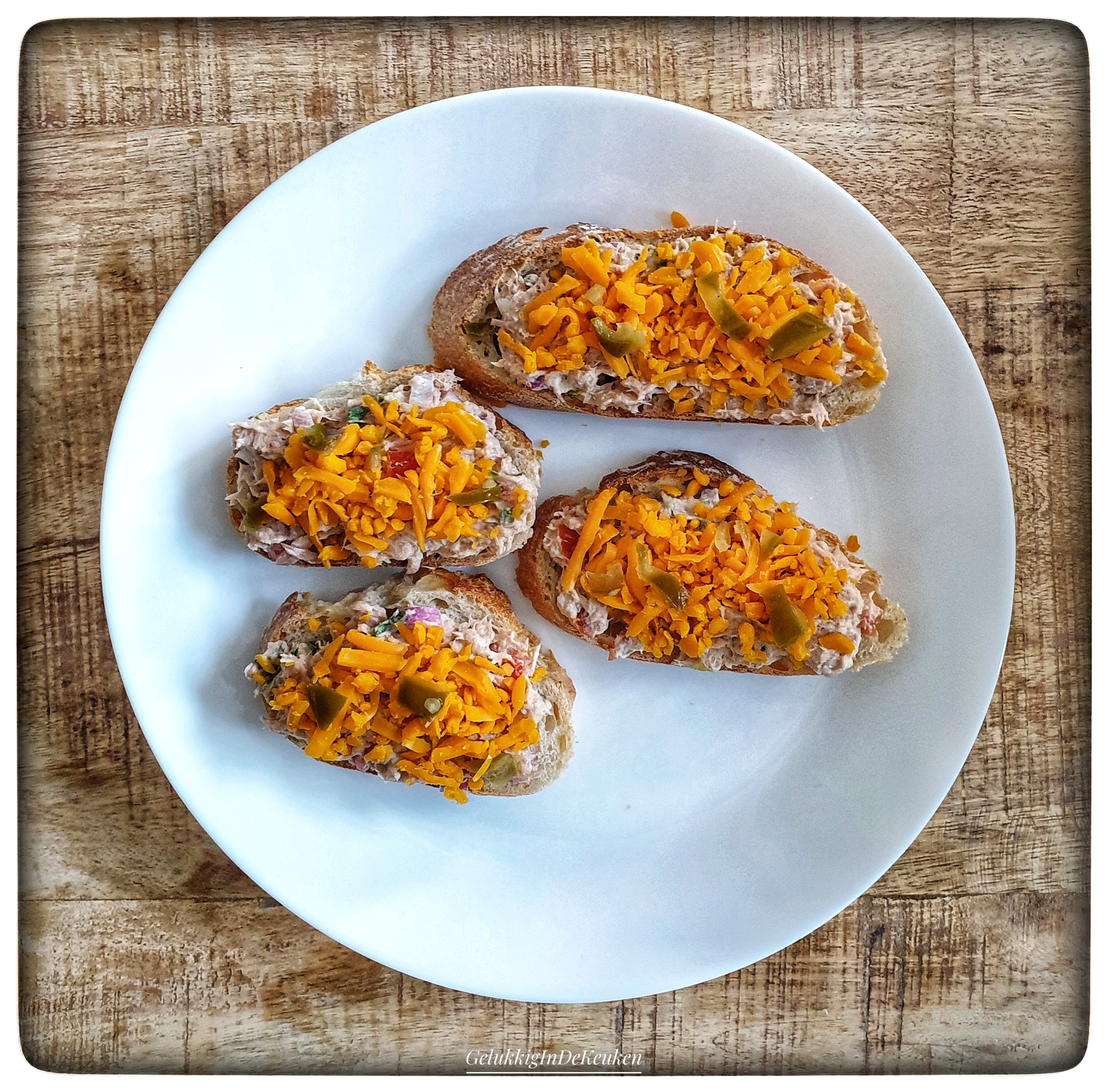 Verdeel het tonijnmengsel over de plakjes stokbrood, verdeel de kaas en stukjes jalapeño erover.