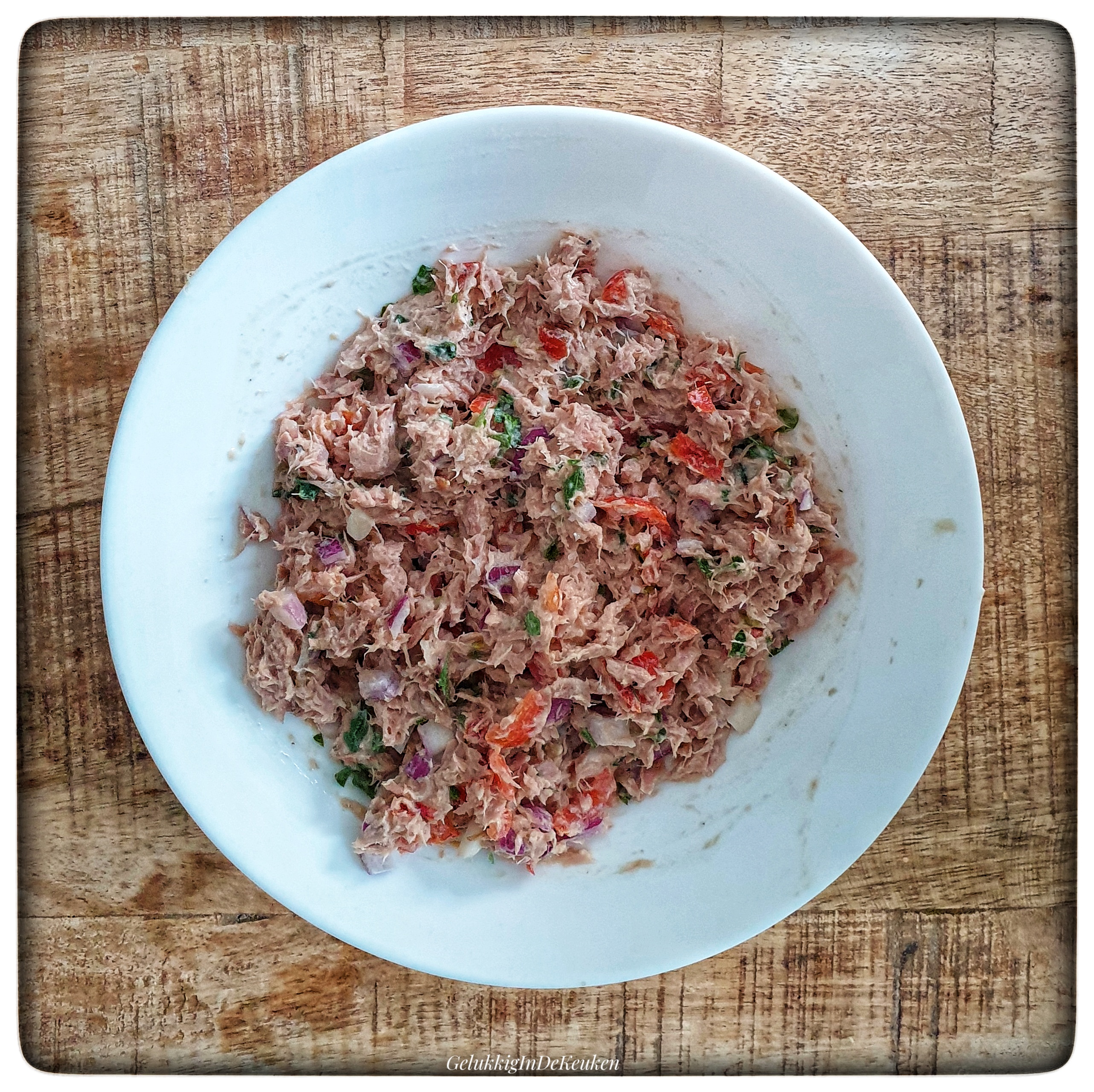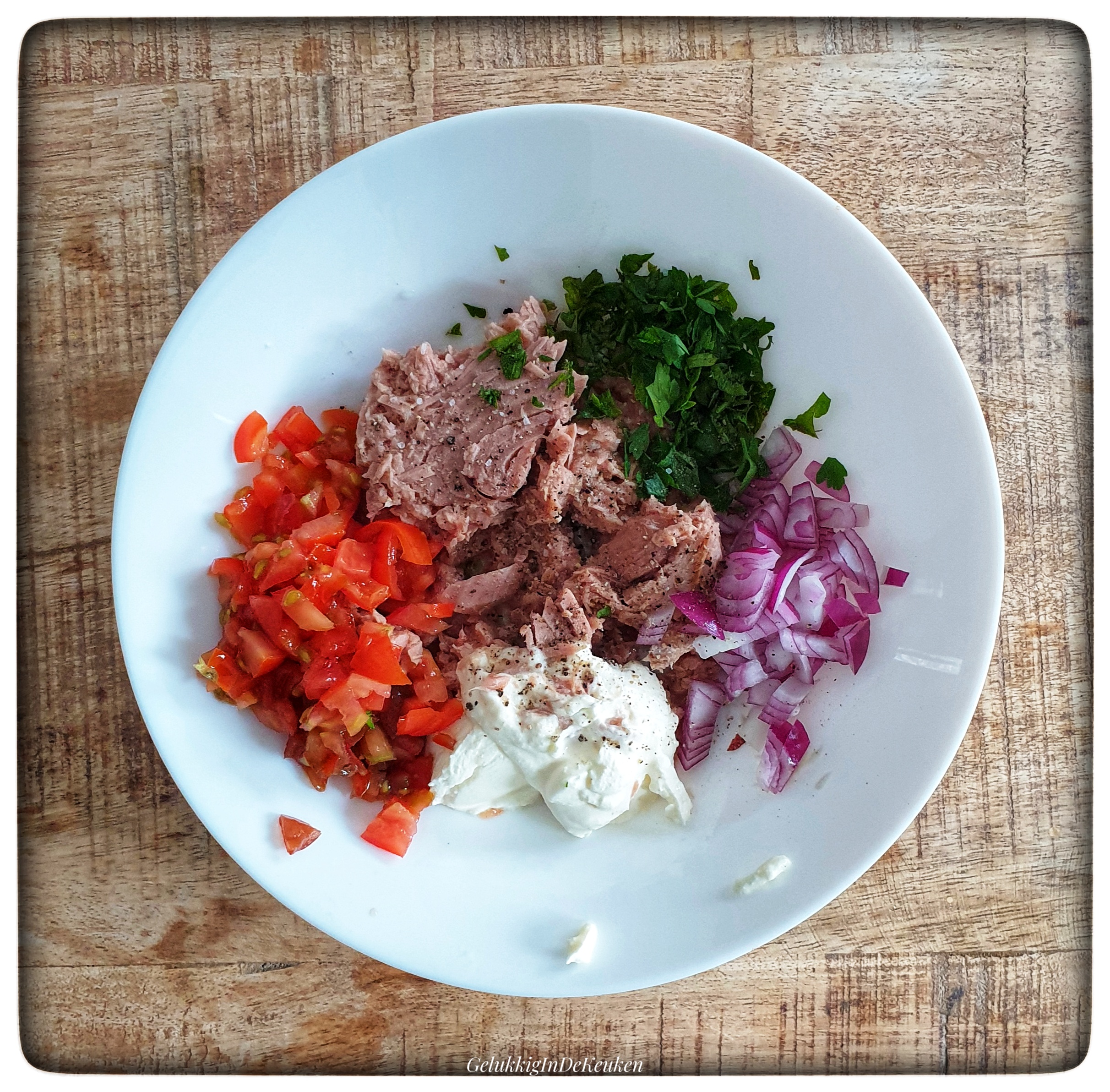 Meng de tonijn met de ui, crème fraîche, peterselie, cherrytomaatjes, citroensap en peper en zout.