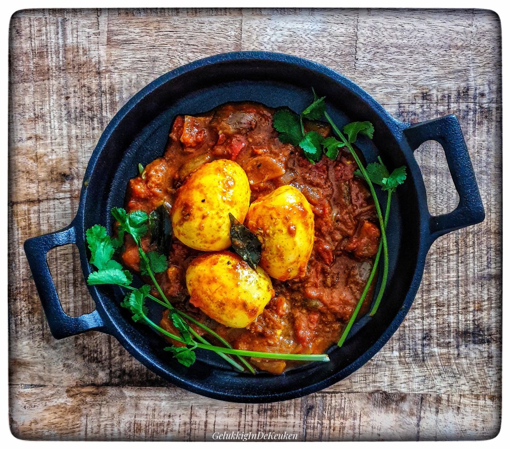 Deze ei curry heeft niet heel veel saus, het vocht in de curry moet juist een beetje verdampt zijn.