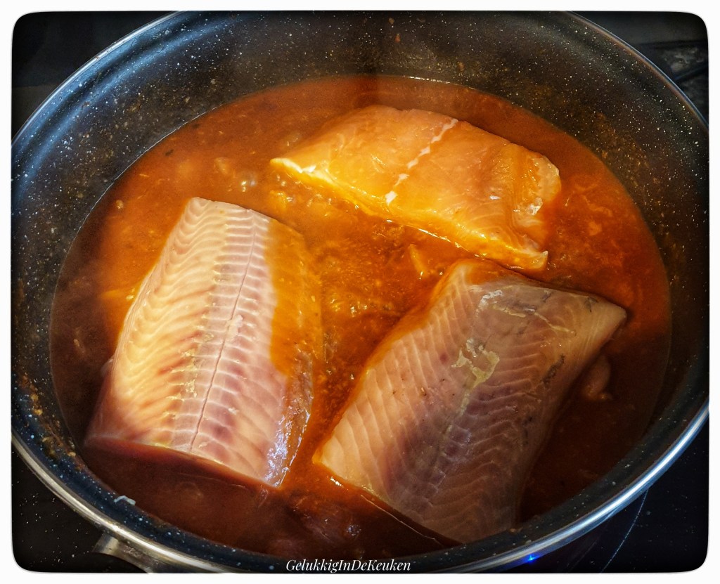 Leg de zalmfilets erin en laat het met een deksel zachtjes koken tot het gaar is. Tussentijds de zalmfilets één keer omdraaien.