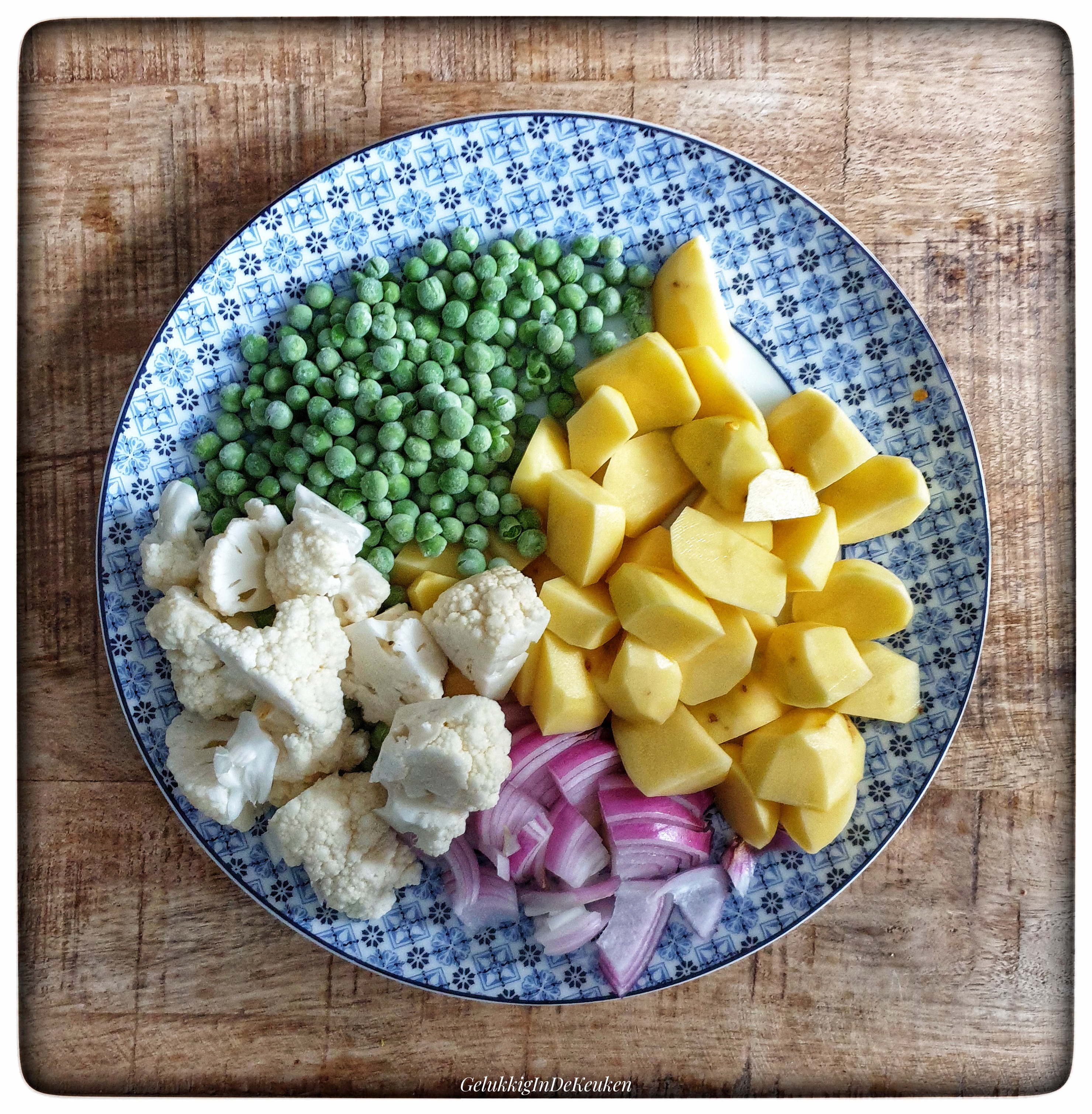 Een groentecurry met aardappelen, bloemkool en doperwten. De curry is mild qua smaak.