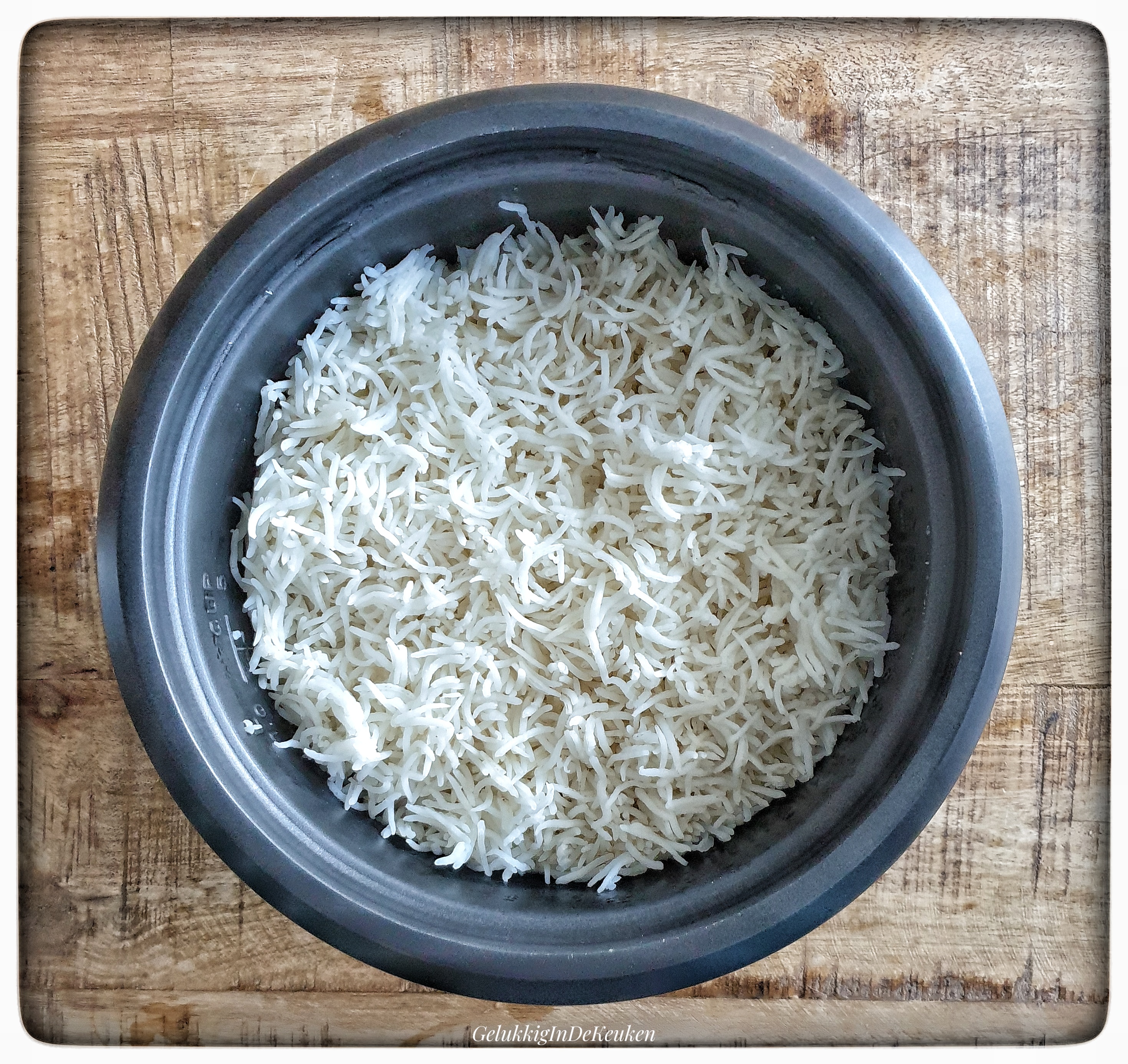 Kook de rijst met een snufje zout in 540 ml water. Ik gebruik een rijstkoker, waardoor de rijst droogkookt en je mooie losse korrels krijgt.