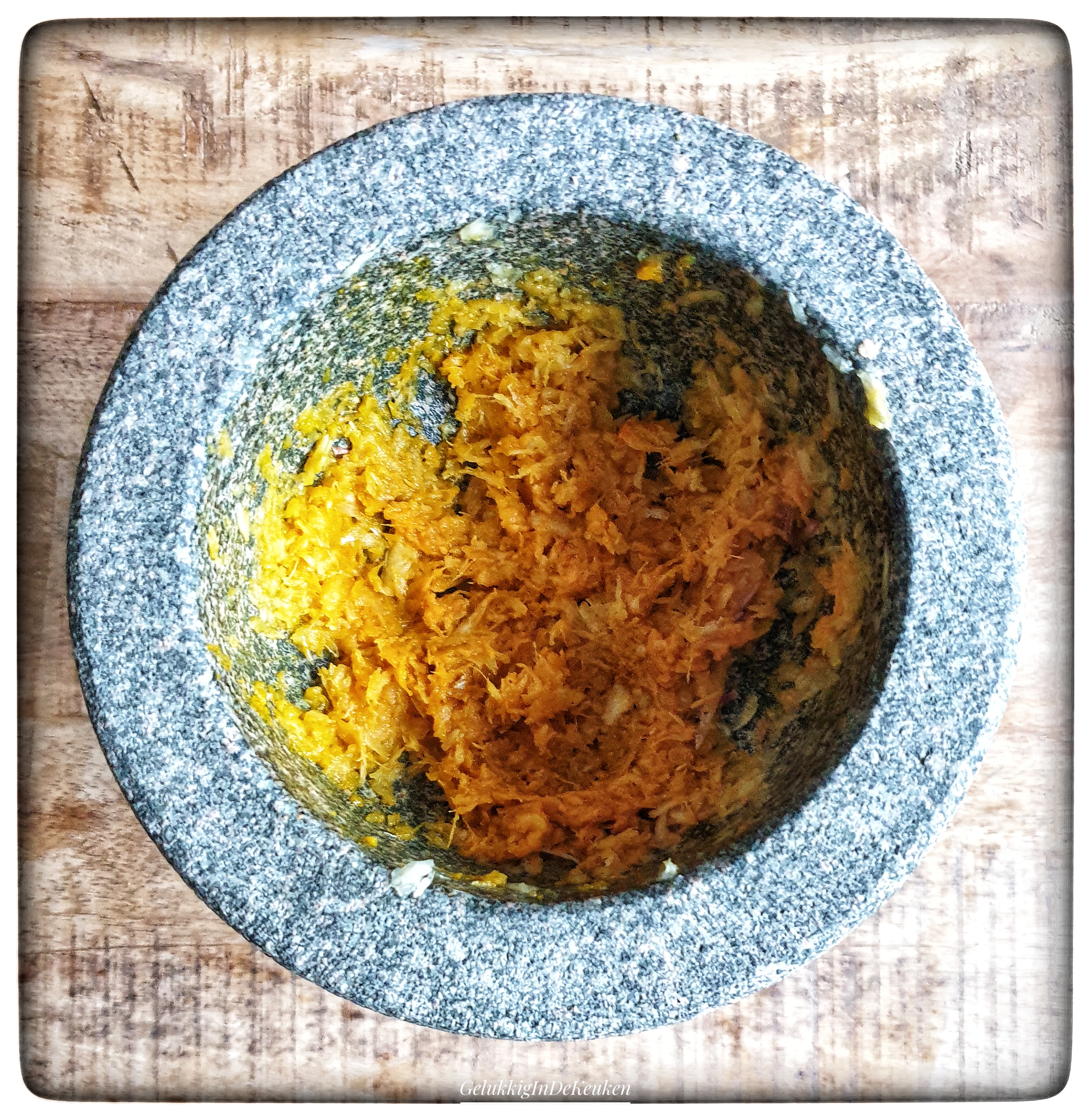 Vijzel de knoflook en gember tot een fijne pasta.