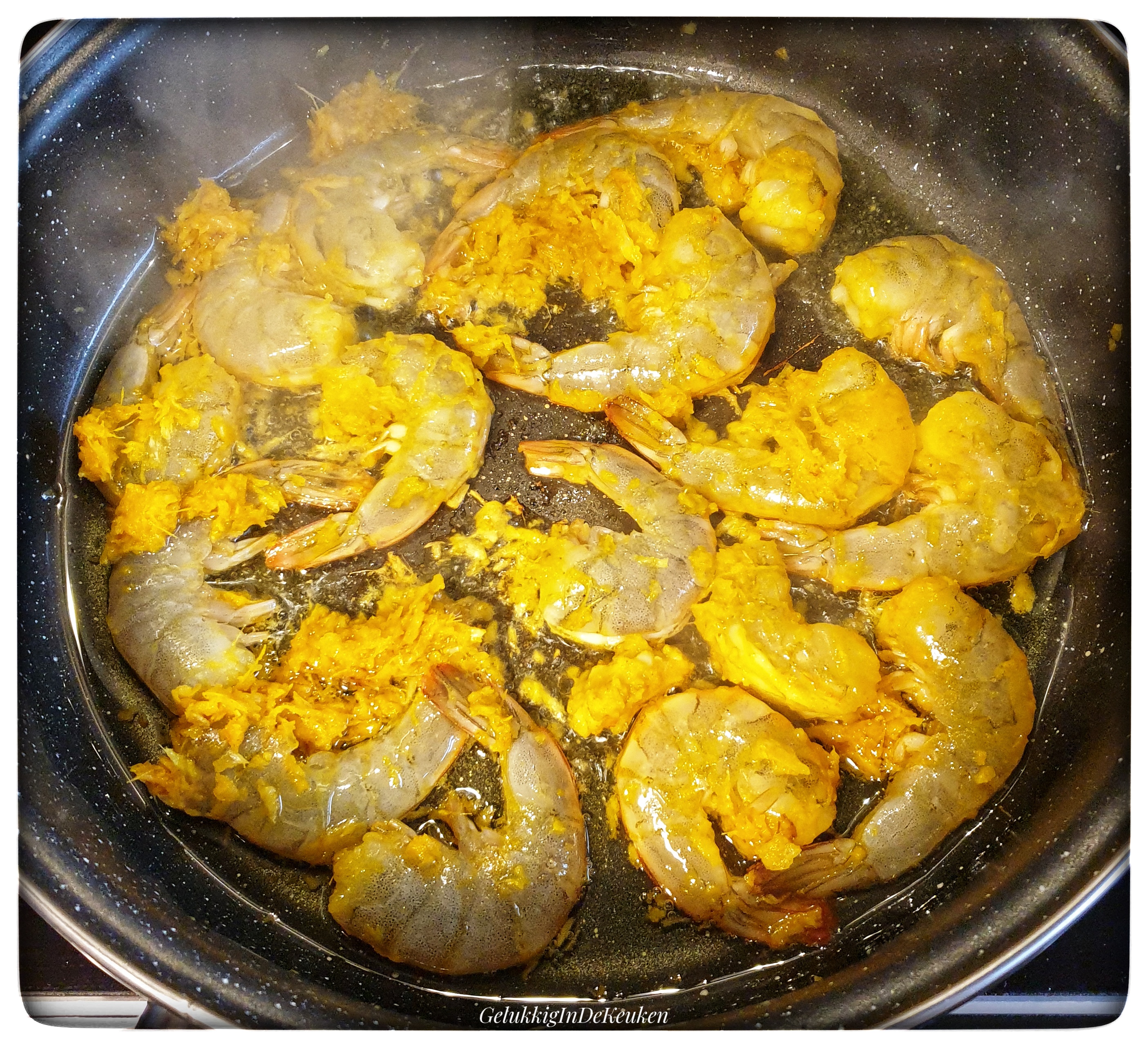 Ik maak dit recept voor garnalen heel vaak. De garnalen wordt gemarineerd in knoflook, gember en kurkuma.