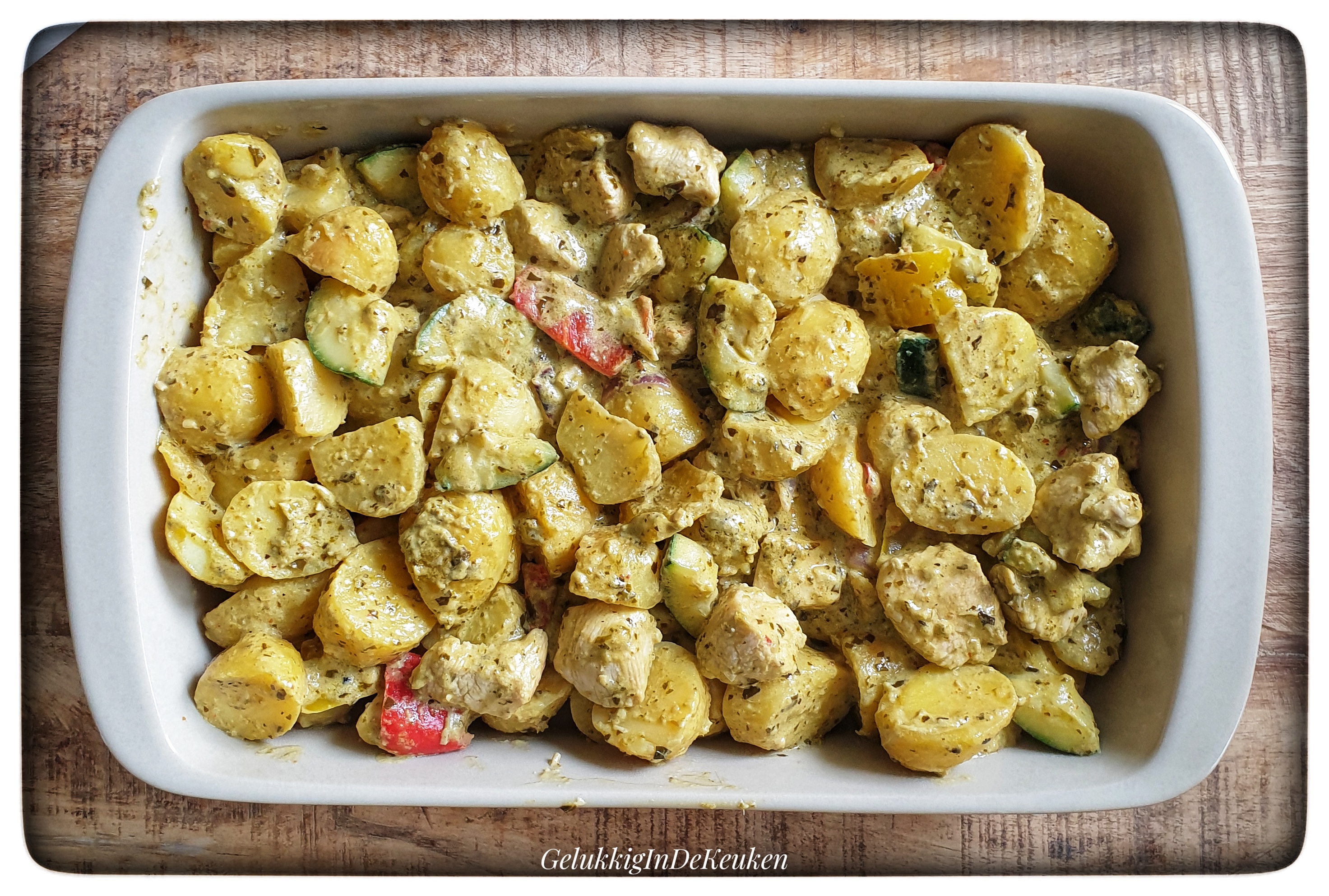 Verwen je familie/vrienden en jezelf met deze heerlijke ovenschotel van aardappelkrieltjes, kip en groenten in pesto.