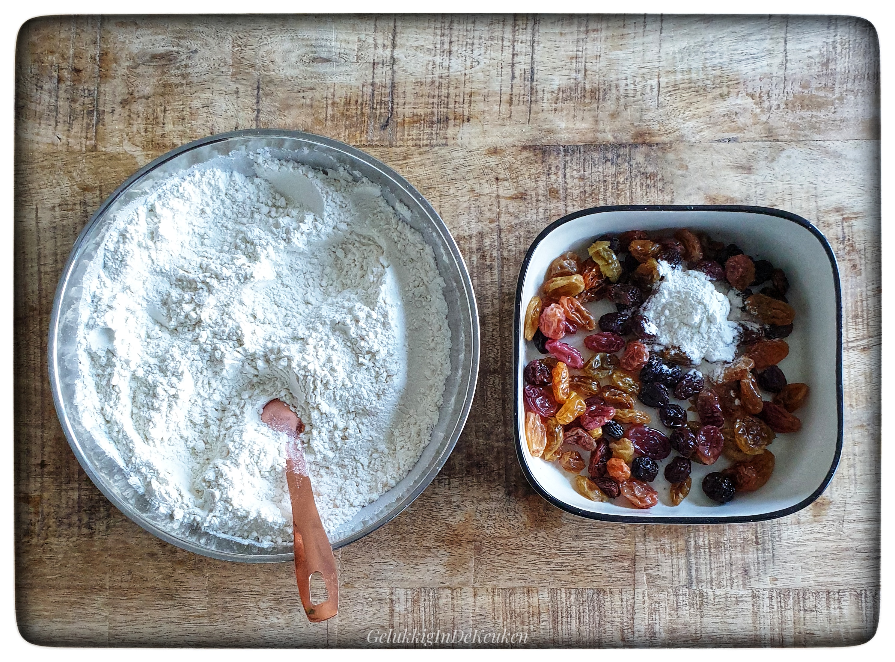 Neem 1 eetlepel bloem en meng dit met de rozijnen.