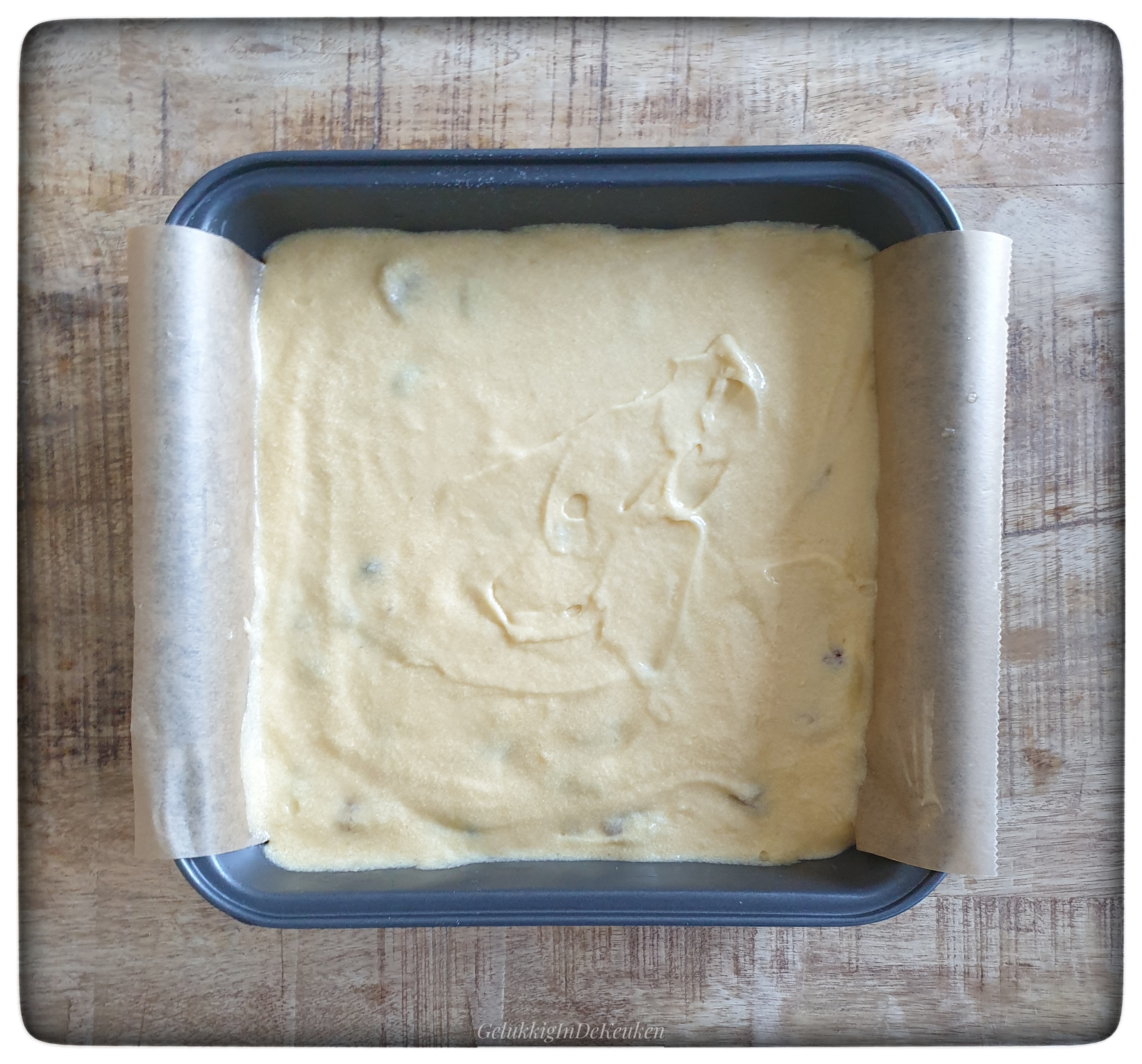Schep het beslag in een bakvorm bekleed met bakpapier. Zet het in de oven en laat de cake in 35-40 minuten gaar bakken. Een cakeprikker moet er schoon uitkomen.