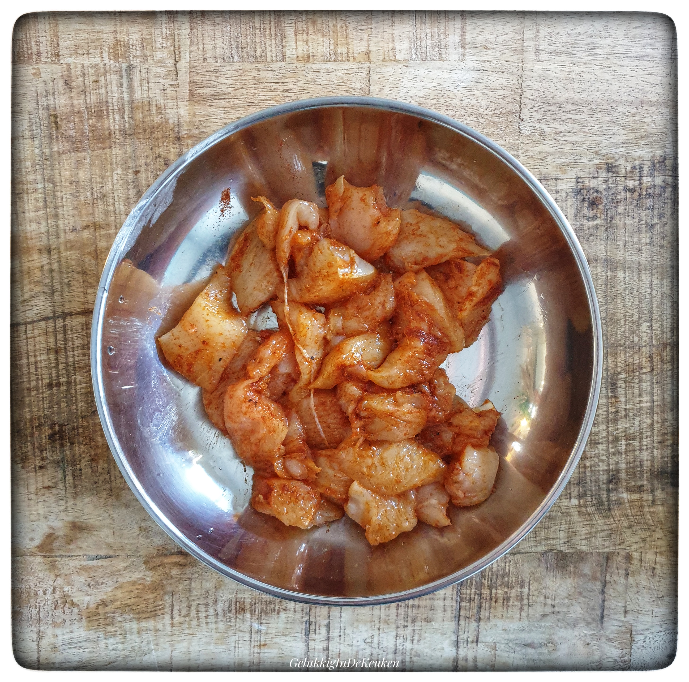Snijd de kip in hapklare stukjes en meng het met de paprikapoeder en knoflookgranulaat. Voeg peper en zout naar smaak toe en meng het doorelkaar.
