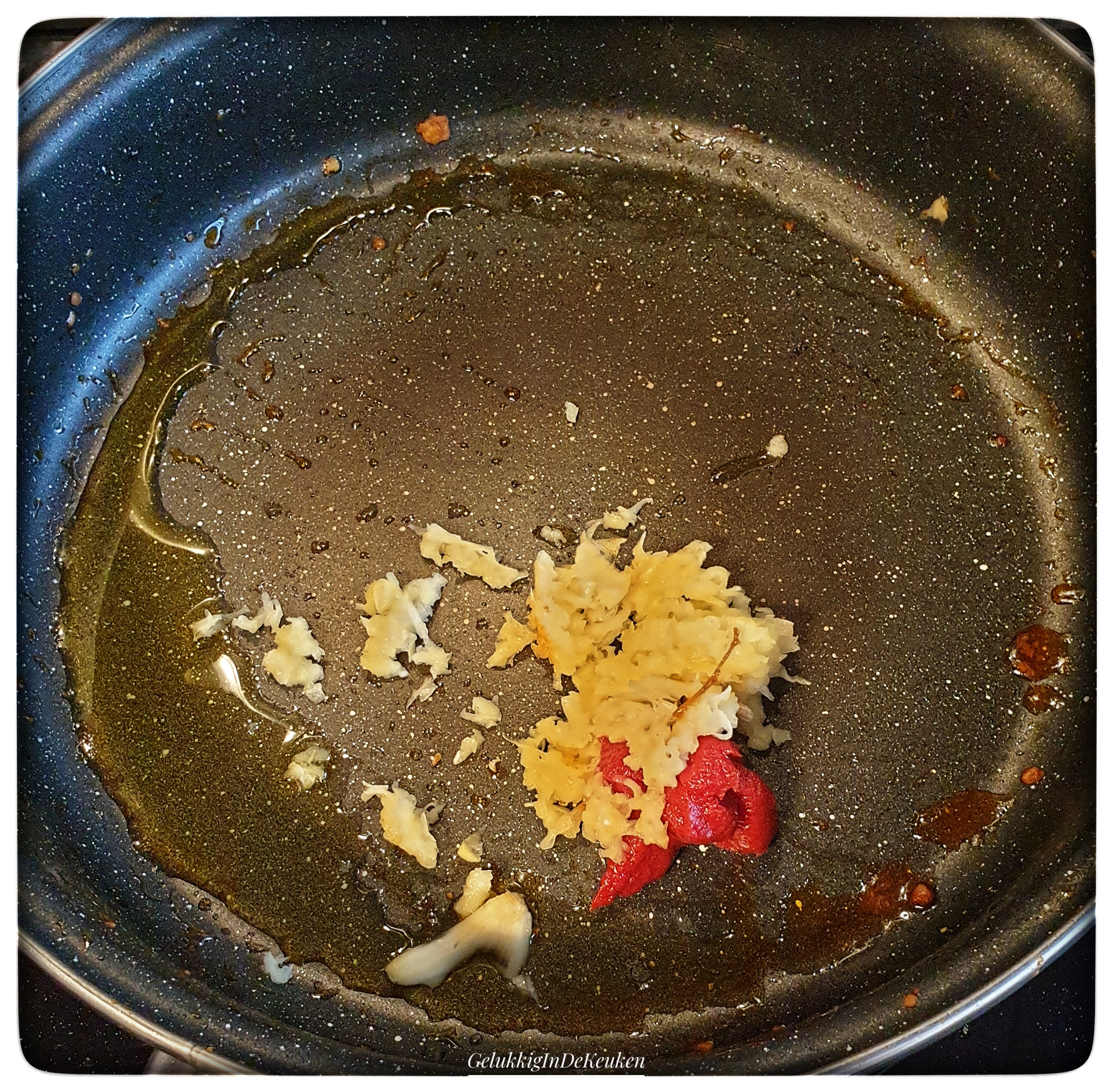 Voeg in dezelfde pan eventueel nog een beetje olie toe en bak hierin de knoflook en tomatenpuree op laag vuur, ca. een halve minuut.