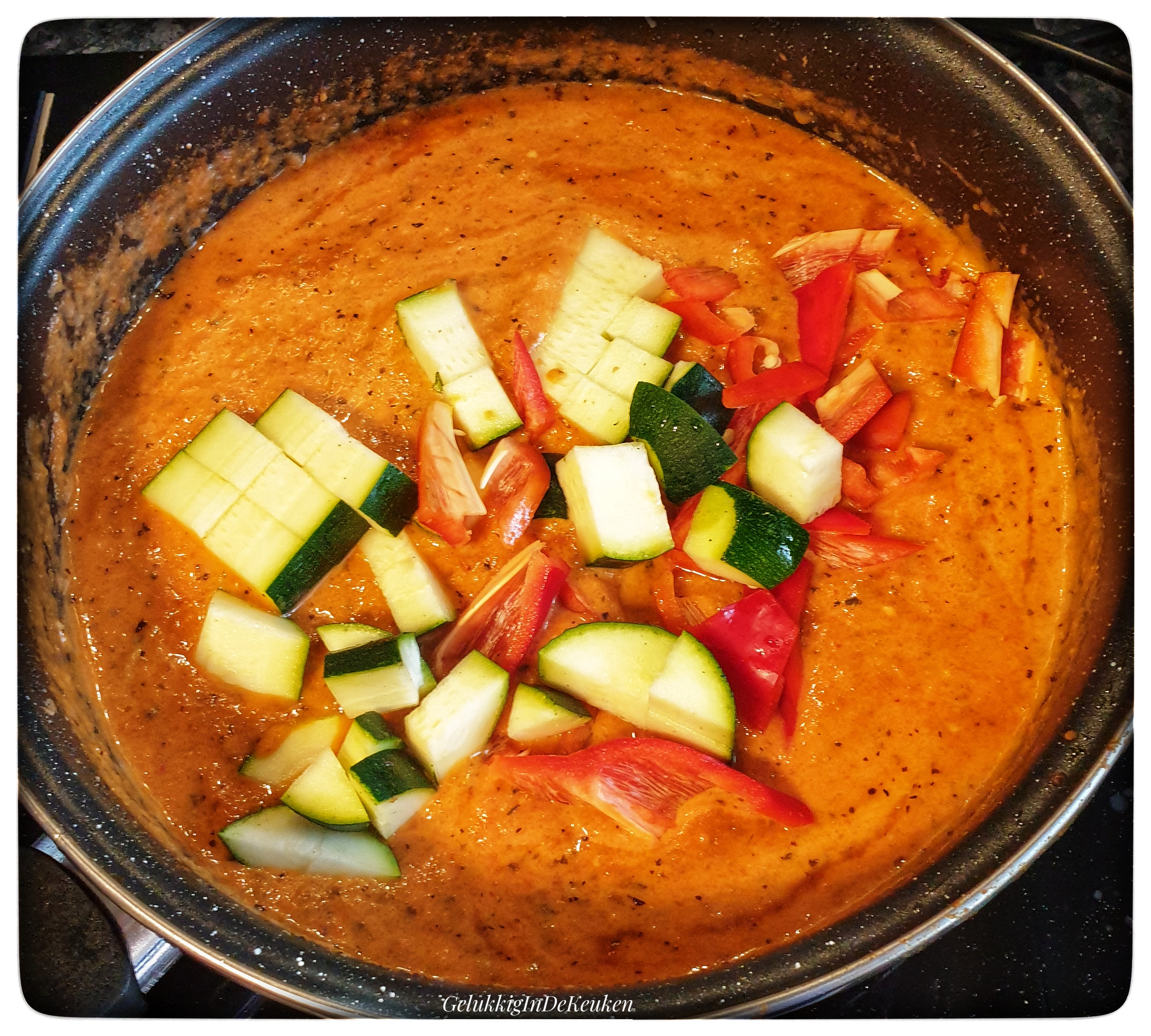 Voeg de room en paprika toe aan de saus. De courgette na 3 minuten toevoegen en ca. 4 minuten koken.