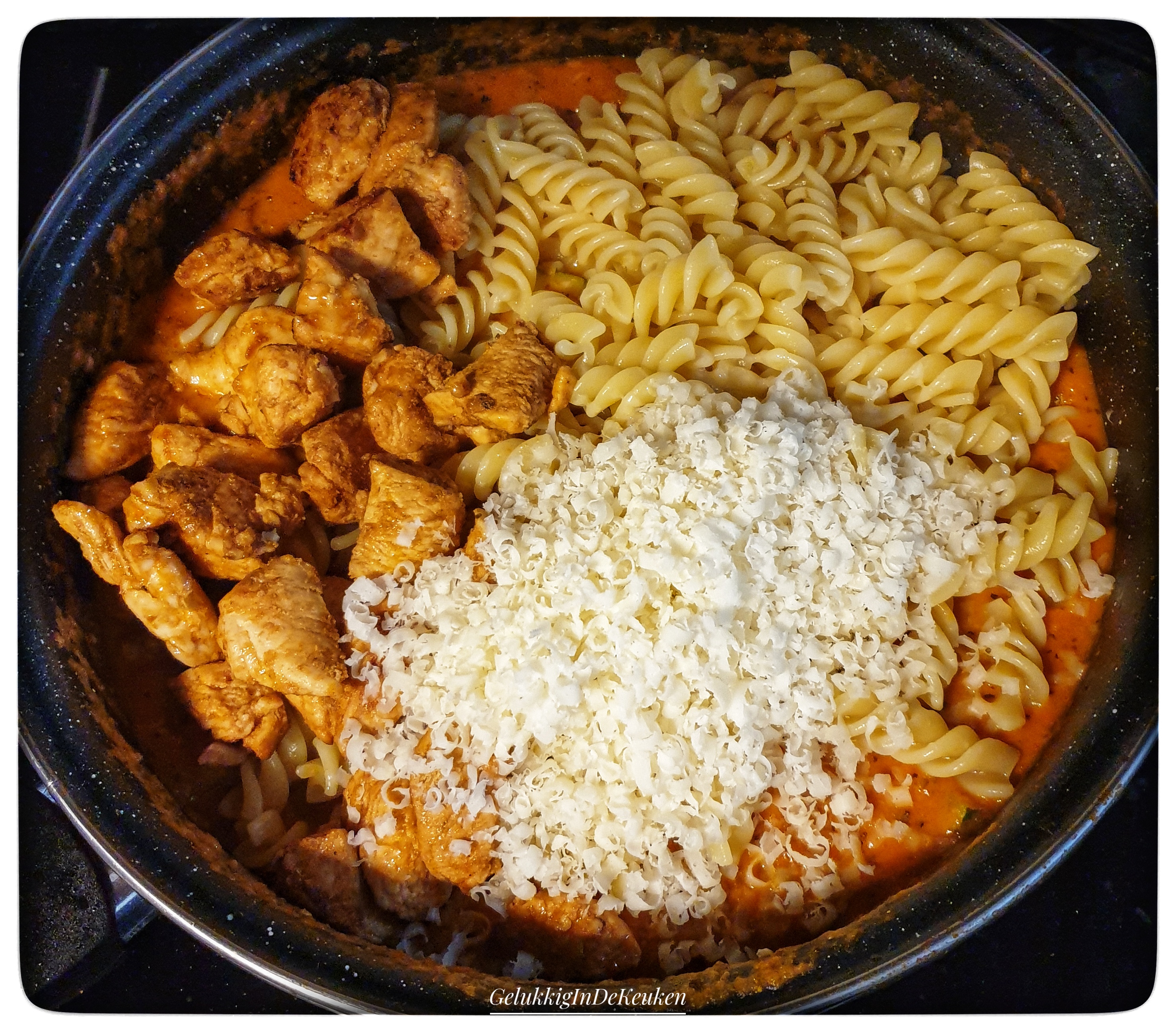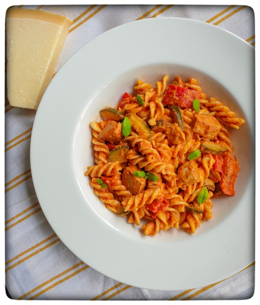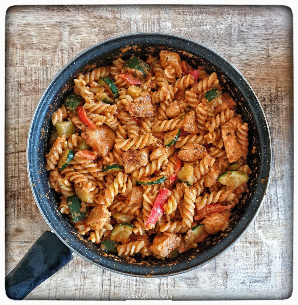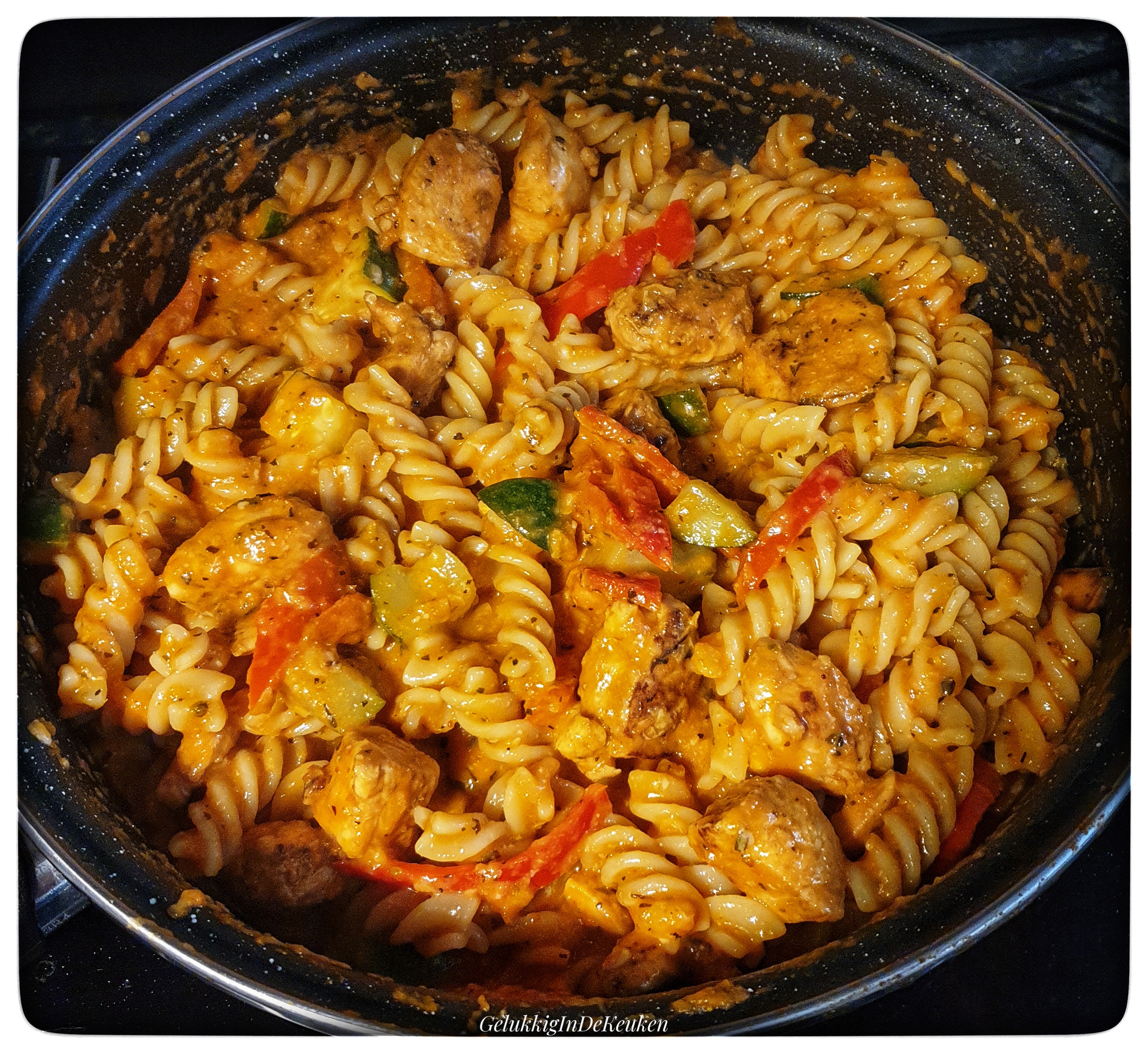 Pasta en kip in een pittige en romige saus van verse tomaten. Probeer zoveel mogelijk rijpe tomaten te nemen, dat geeft een diepere smaak aan de saus.