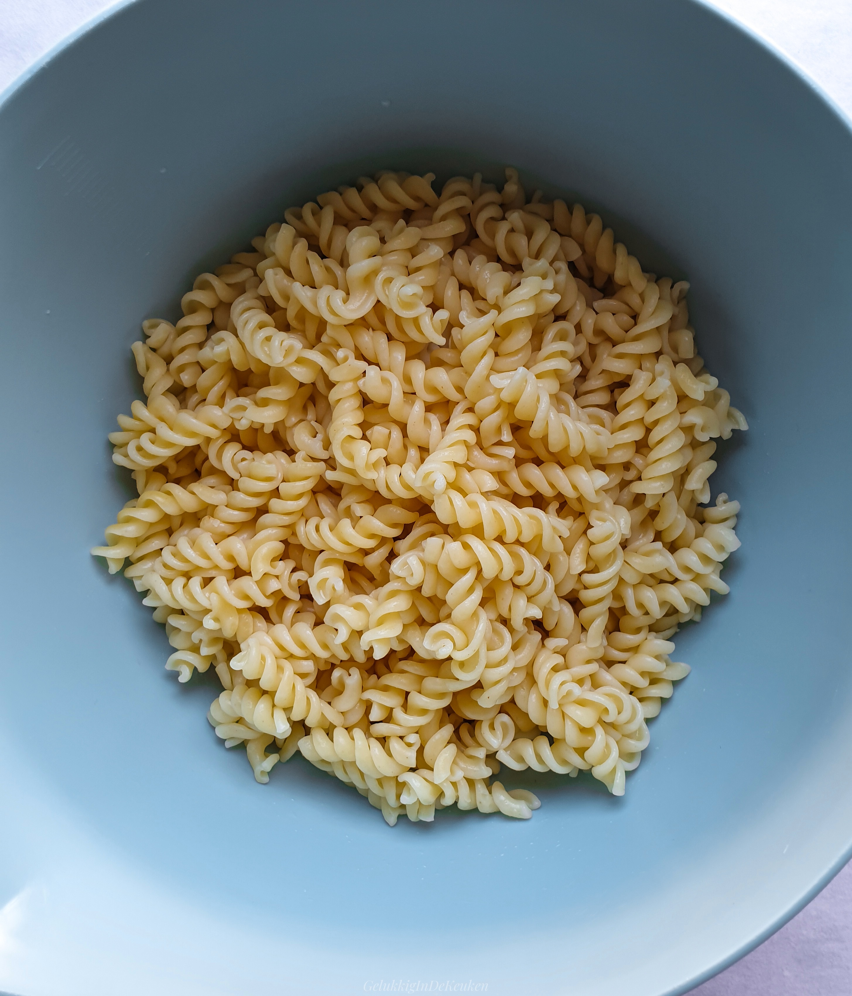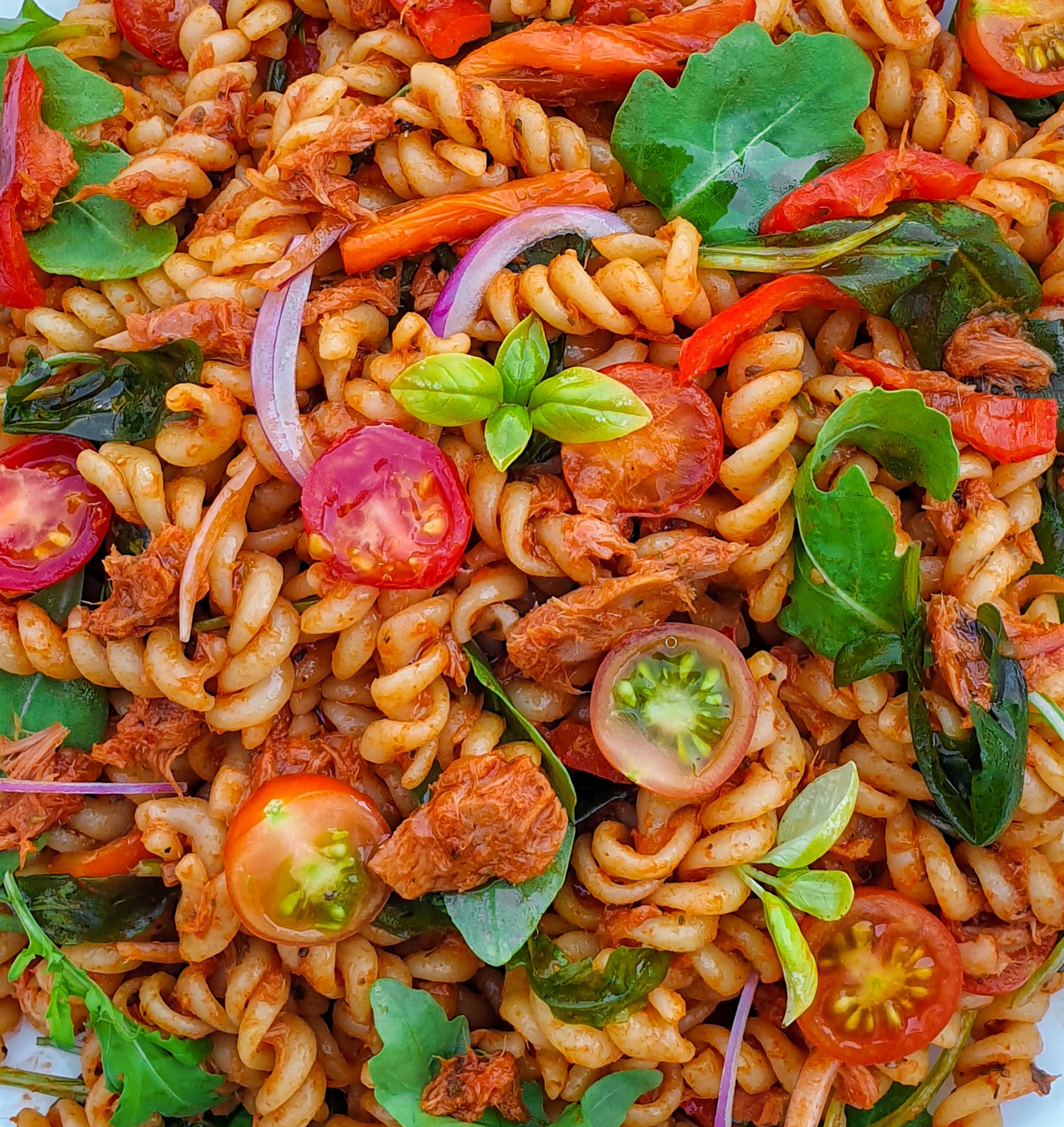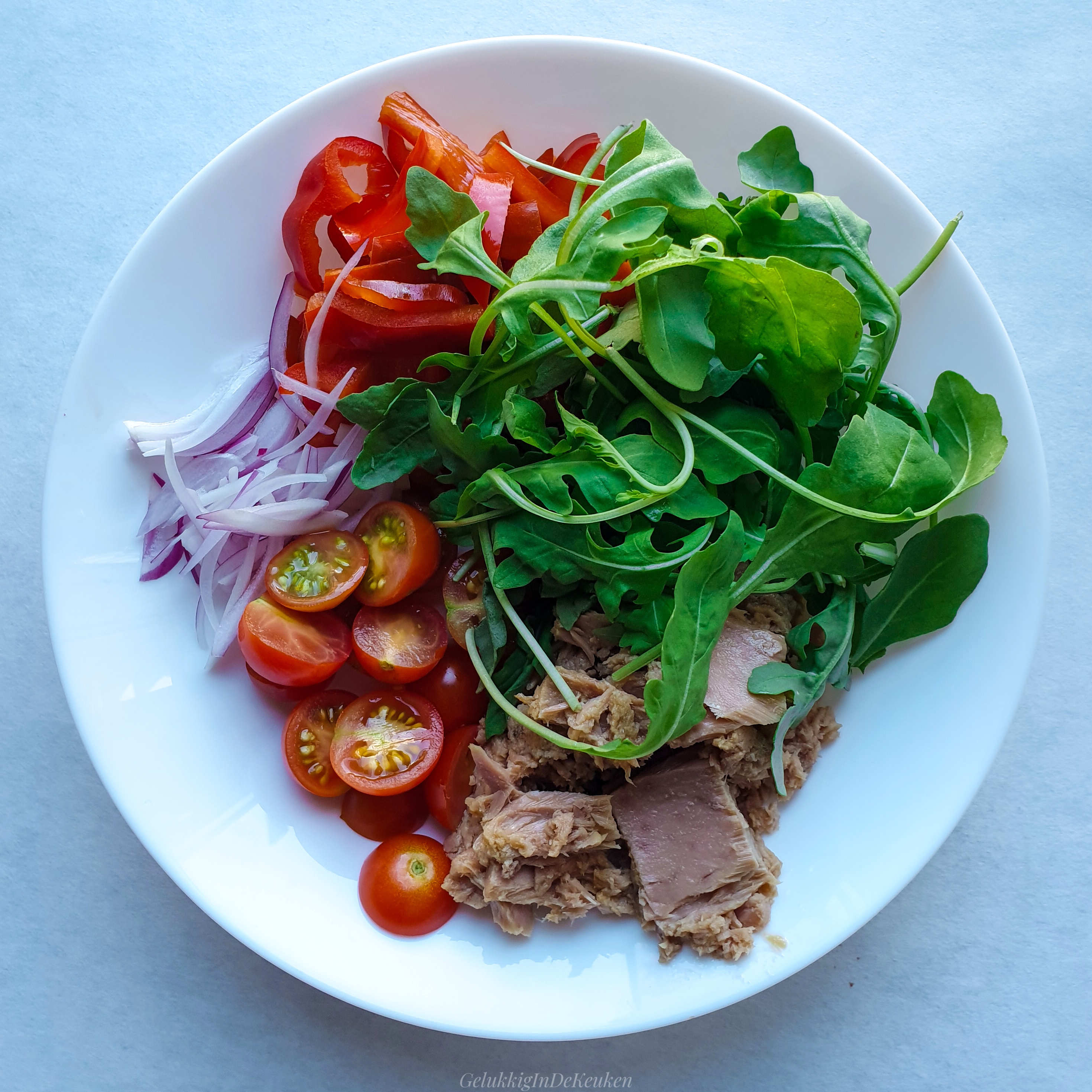 Deze pastasalade is zo lekker! In de salade gaat tonijn, rode ui, cherrytomaatjes, puntpaprika en rucola.