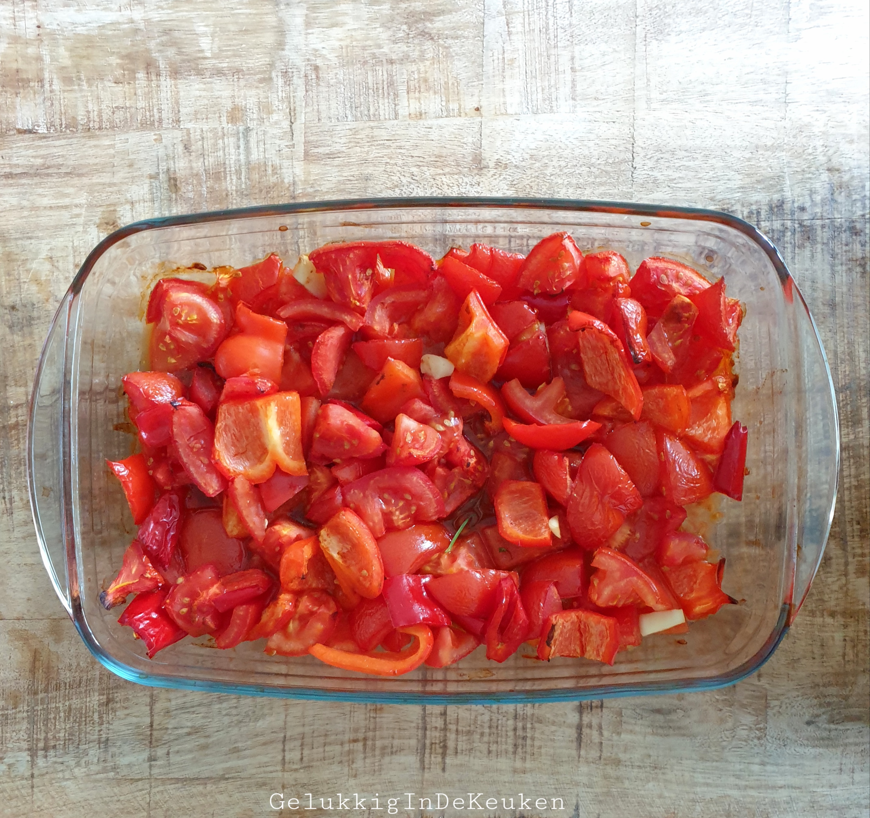 Doe de paprika, tomaten, knoflook, paprikapoeder en olijfolie in een ovenschaal en meng alles met elkaar. Zet de schaal in de oven voor 45 minuten. Eventueel tussendoor een keer omscheppen.