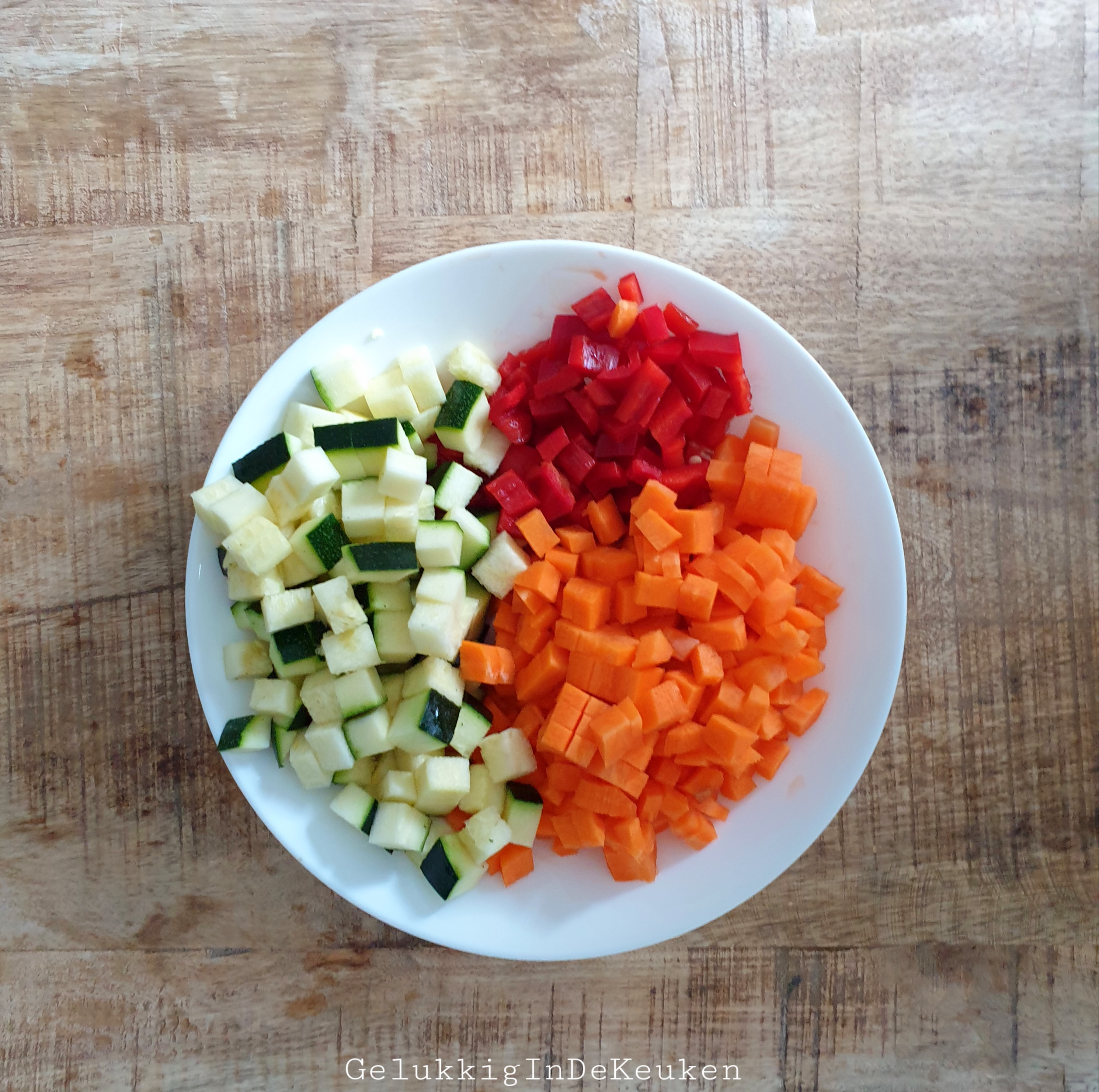 Snijd ook de wortel en courgette in kleine blokjes.