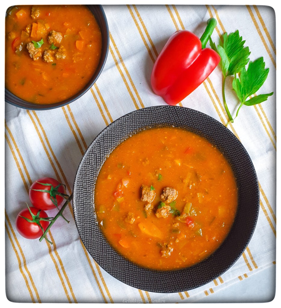 Momenteel heb ik aardig wat zongerijpte tomaten uit de moestuin. Naast een salade verwerk ik het ook graag in soep.