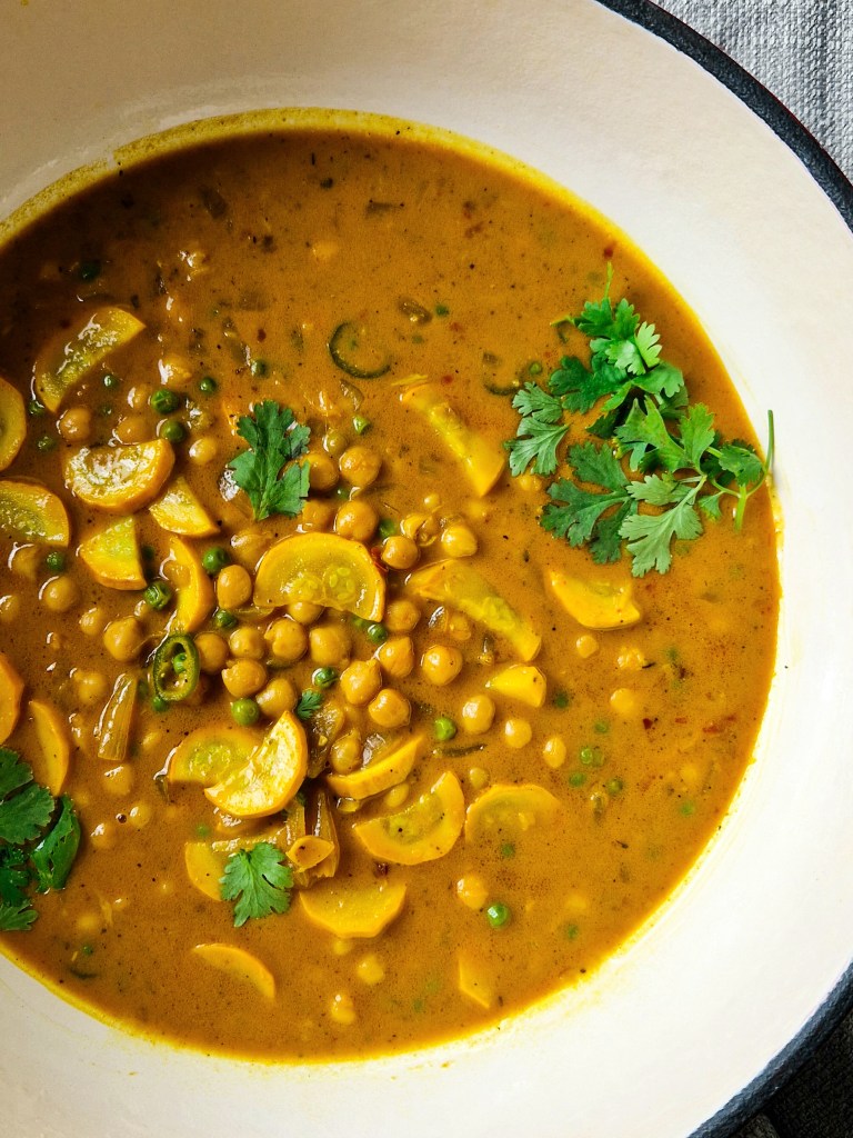 Deze vegetarische curry van kikkererwten en groenten is lekker romig door de kokosmelk, verwarmend door de specerijen en mild qua pittigheid.