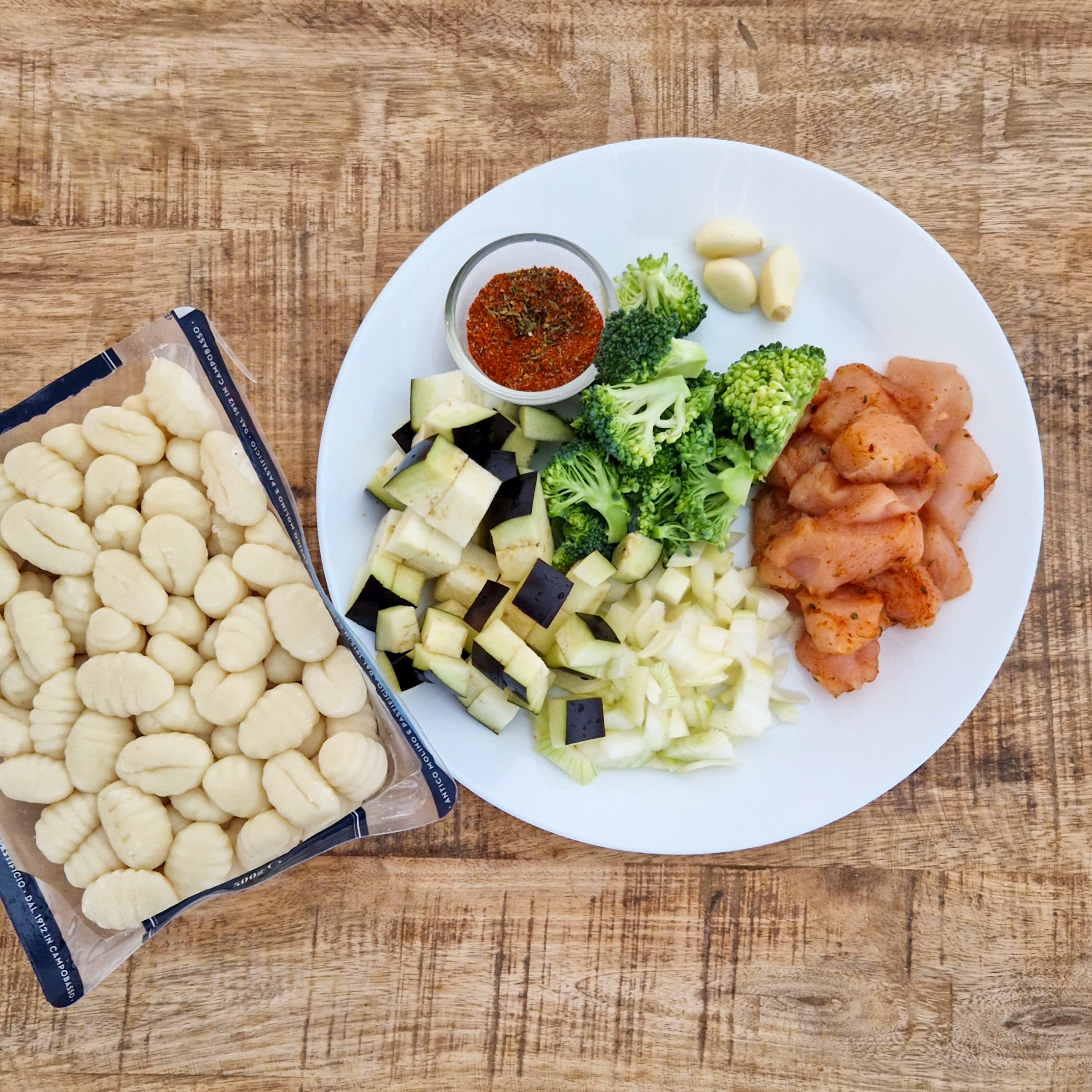 Doe de knoflook, specerijenmengsel en gnocchi erbij en bak het kort mee.