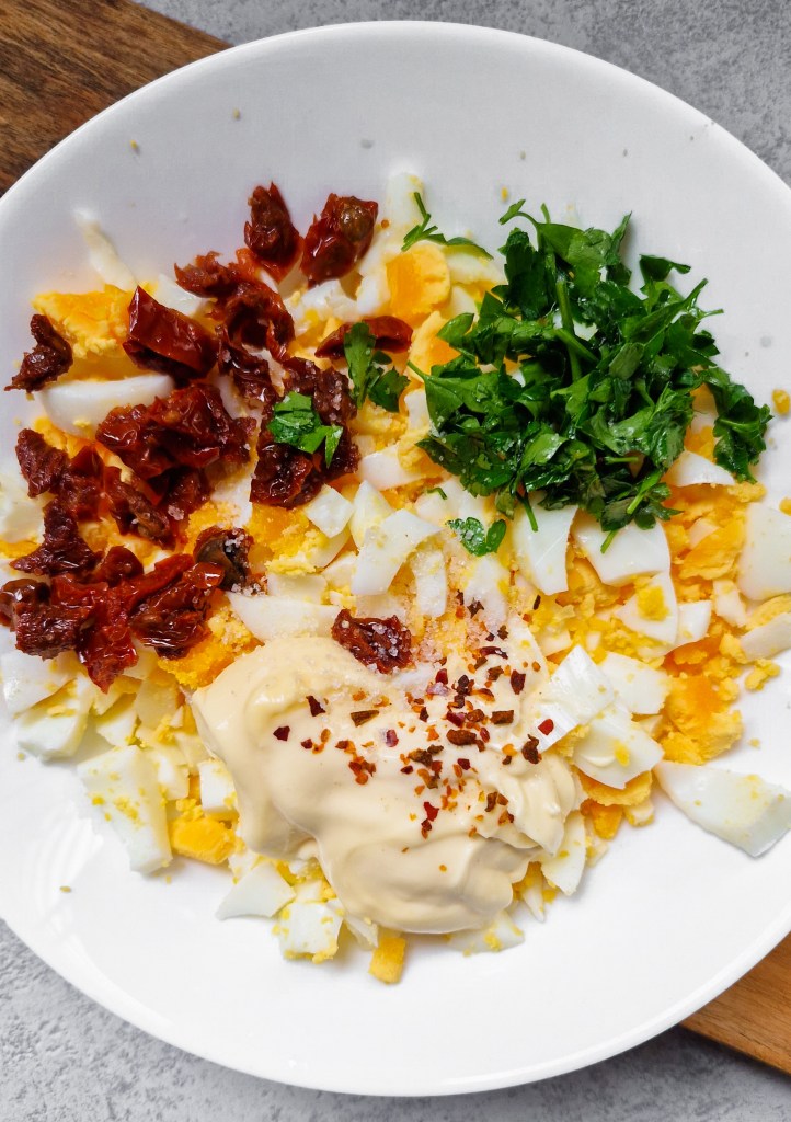 Pel en snijd de eieren in stukjes. Snijd de zongedroogde tomaatjes in kleine stukjes en hak de peterselie fijn.