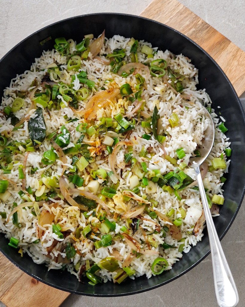 Deze rijst is zo lekker! De smaken van de bosui en specerijen trekt mooi subtiel in de rijst. Je kan hierbij gegrilde kip of vis serveren, maar ook curries past hier perfect bij.