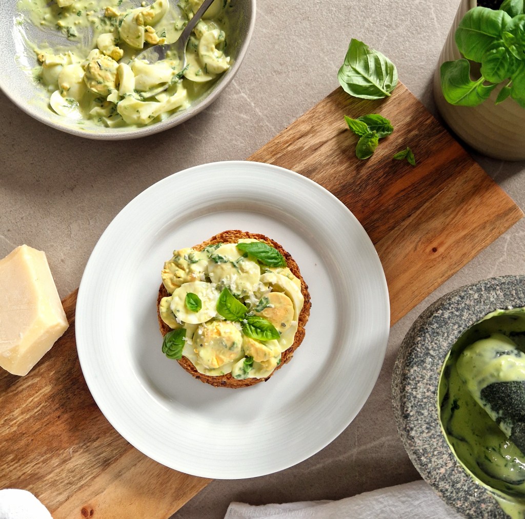 Je gaat smullen van een broodje met deze zelfgemaakte eiersalade met basilicummayonaise.