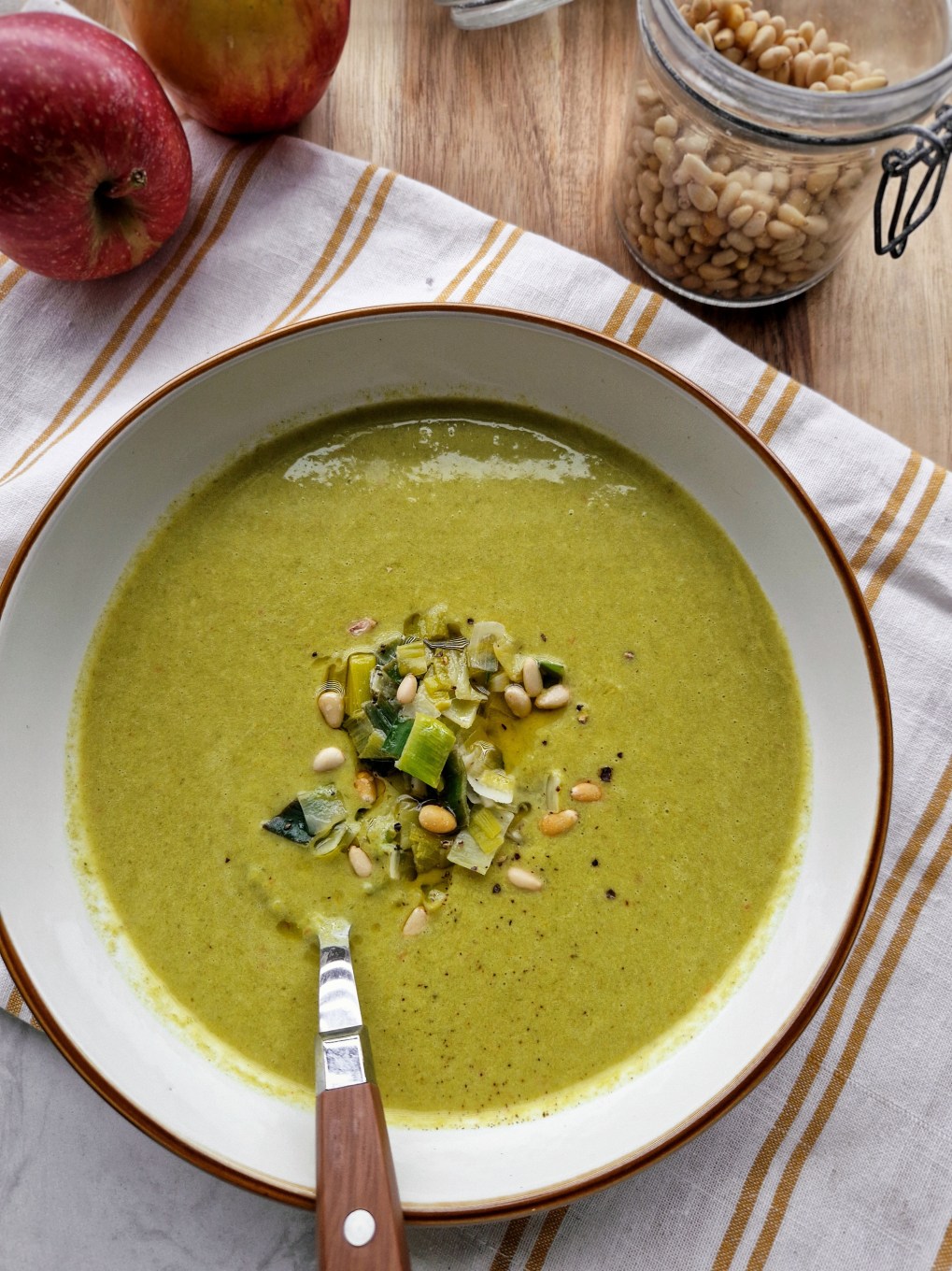 Zet het vuur uit, roer de kookroom erdoor en pureer de soep glad. Roer tot slot de achtergehouden prei erdoor.
