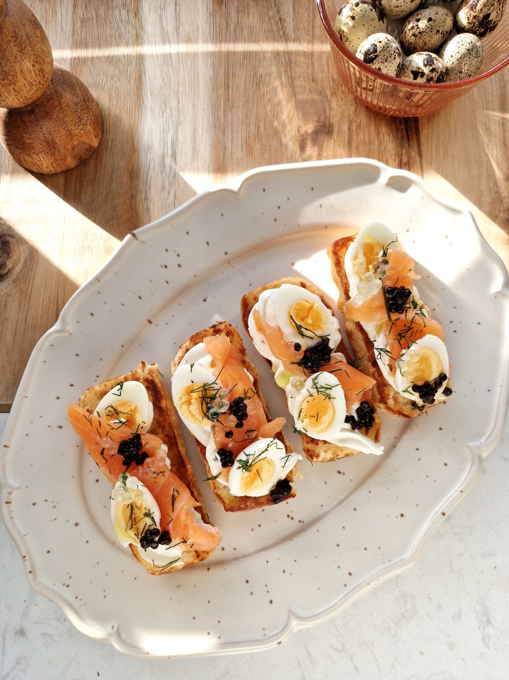 Verdeel de gerookte zalm en gehalveerde kwarteleitjes erop en garneer met de citroenparels en dille.